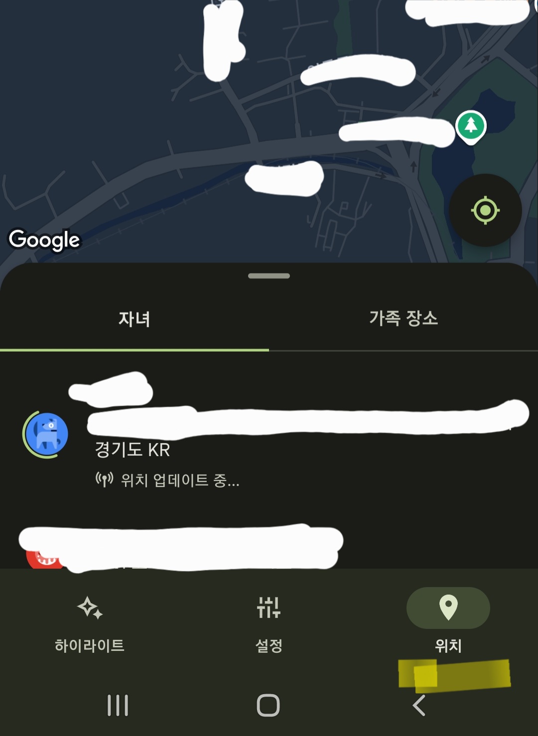 앱 하단에 <위치>를 클릭하시면 현재 자녀의 위치를 확인할 수 있습니다.