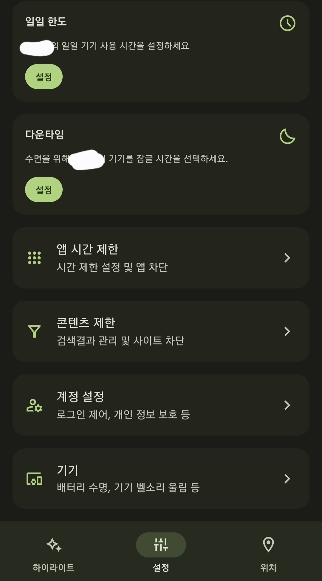 이제 기기 일일 사용 시간과 앱 시간 제한, 콘덴츠 제한 등을 설정할 수 있습니다.