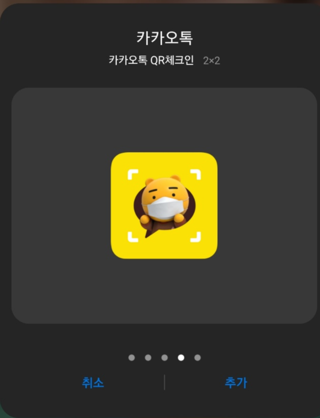 ③ 옆으로 넘겨보시면 카카오톡 QR체크인이 뜨실 겁니다. 1X1과 2X2 중에 맘에 드는 크기를 선택하셔서 '추가'를 눌러주시면 휴대폰 화면에 해당 아이콘이 추가됩니다.
