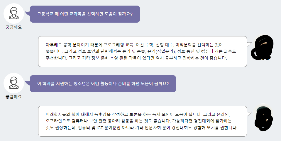 - 전문교과Ⅱ: 디지털 논리 회로, 프로그래밍, 자료구조, 사물 인터넷 서비스 기획, 로봇 지능 개발