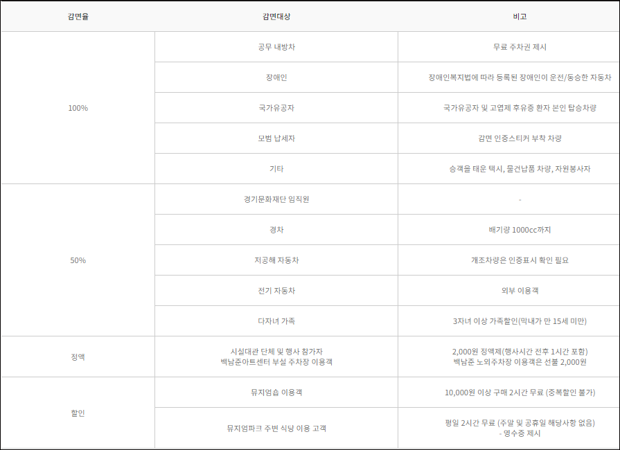 ◑ 할인: 매월 첫째주, 셋째주 주말(토, 일) 무료/ 경기도민 50%할인 / 장애인 등 100% 할인