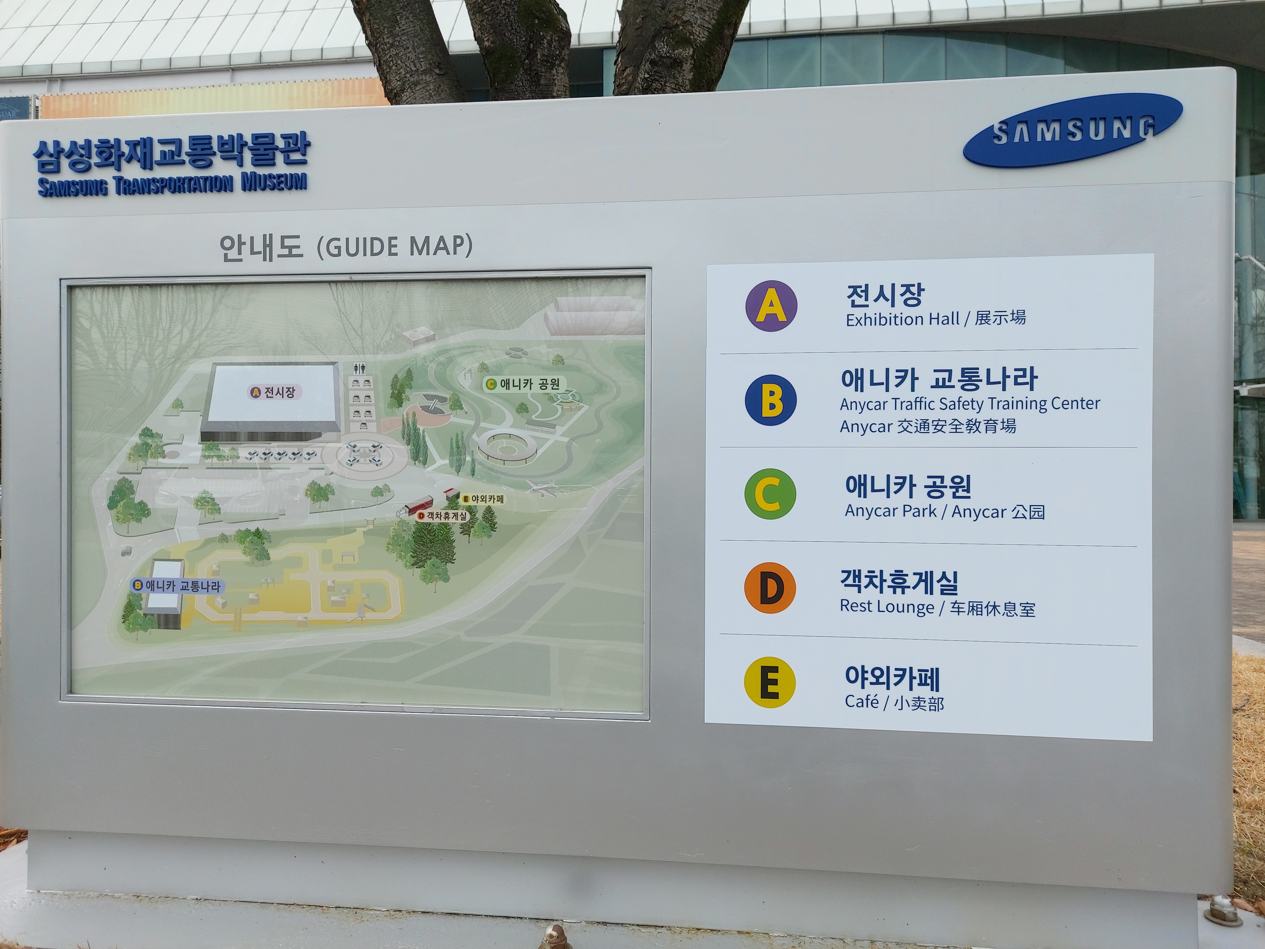 삼성화재교통박물관은 크게 전시장, 애니카 교통나라, 애니카 공원, 객차 휴게실, 야외카페로 구성되어있습니다.