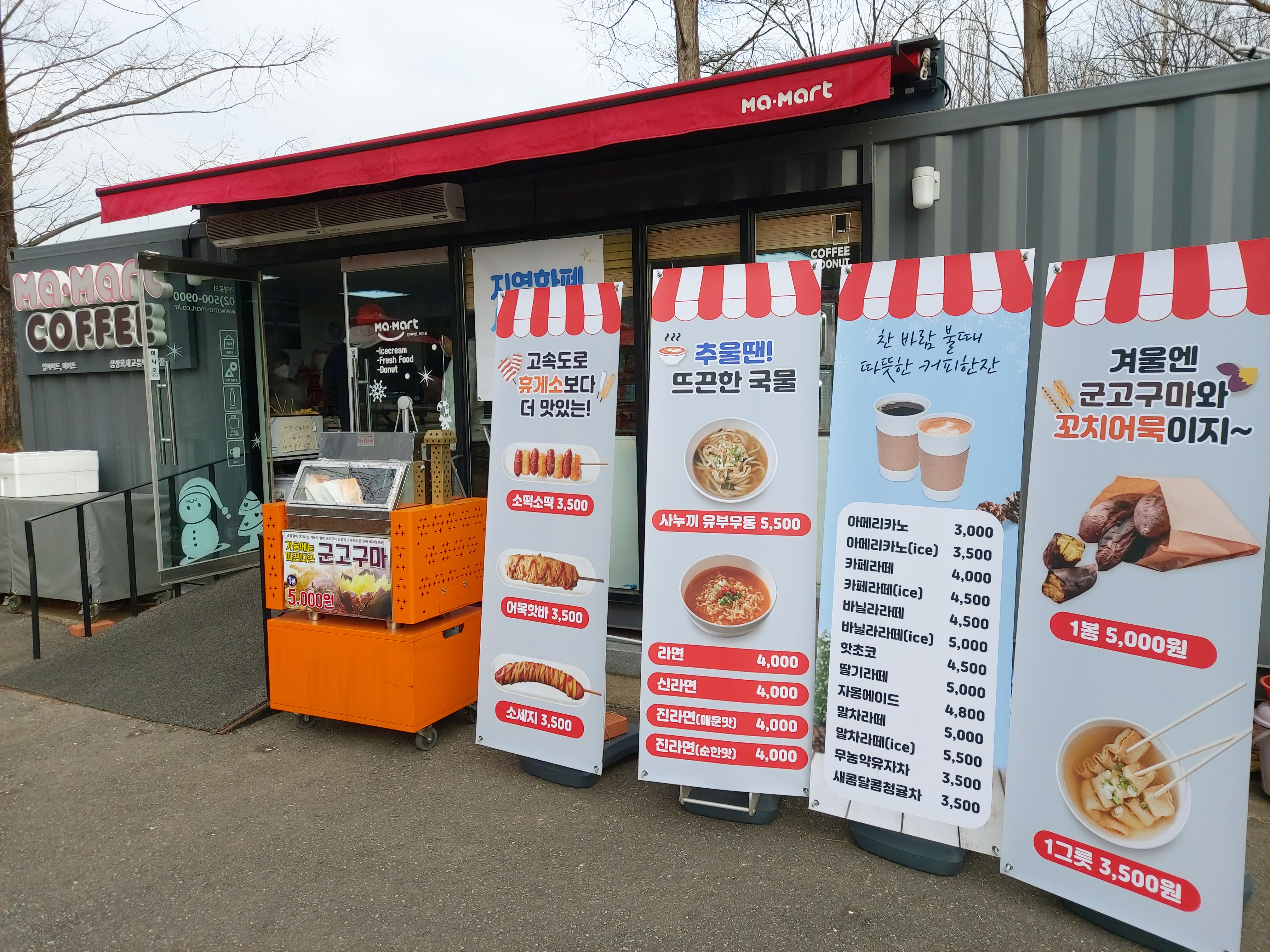 사계절의 아름다움을 만끽하며 자유롭게 뛰어 놀 수 있는 넓은 공원이 마련되어 있습니다. 그리고 간단한 먹거리를 파는 매점과 파라솔 벤치, 기차 모양의 객차 휴게실 공간도 마련되어 있습니다. 매점에서 간식거리를 사거나 집에서 간단히 도시락을 싸와서 객차 휴게실에서 많이 드시더라고요. 우리 아이도 기차 안에 들어가고 싶어했으나 사람들이 너무 많아서 그날은 패스했습니다.