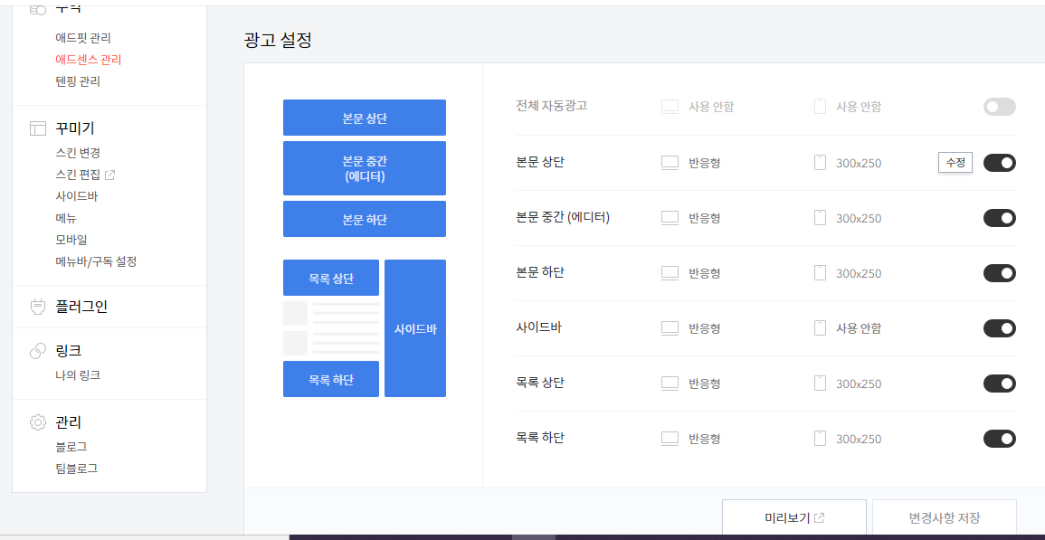 모든 광고를 이런 식으로 바꾸고 마지막으로 '변경사항 저장'을 하시면 완료됩니다.