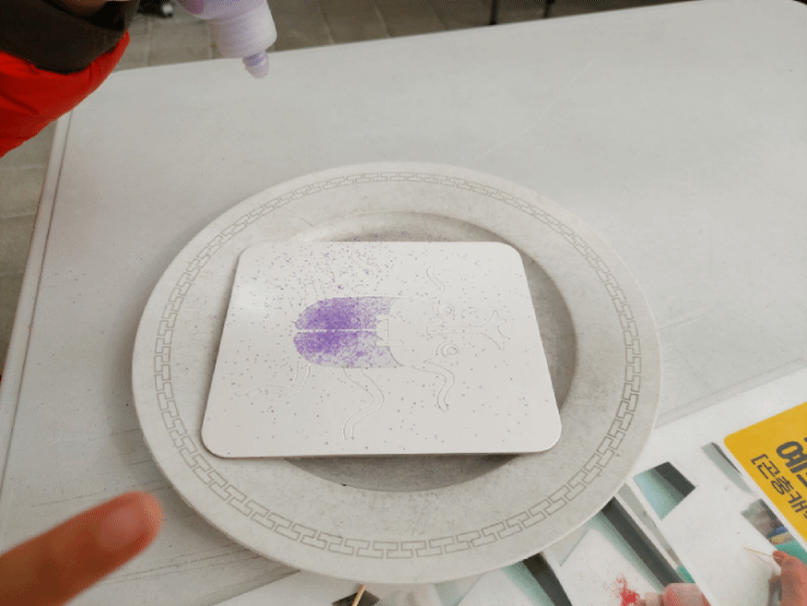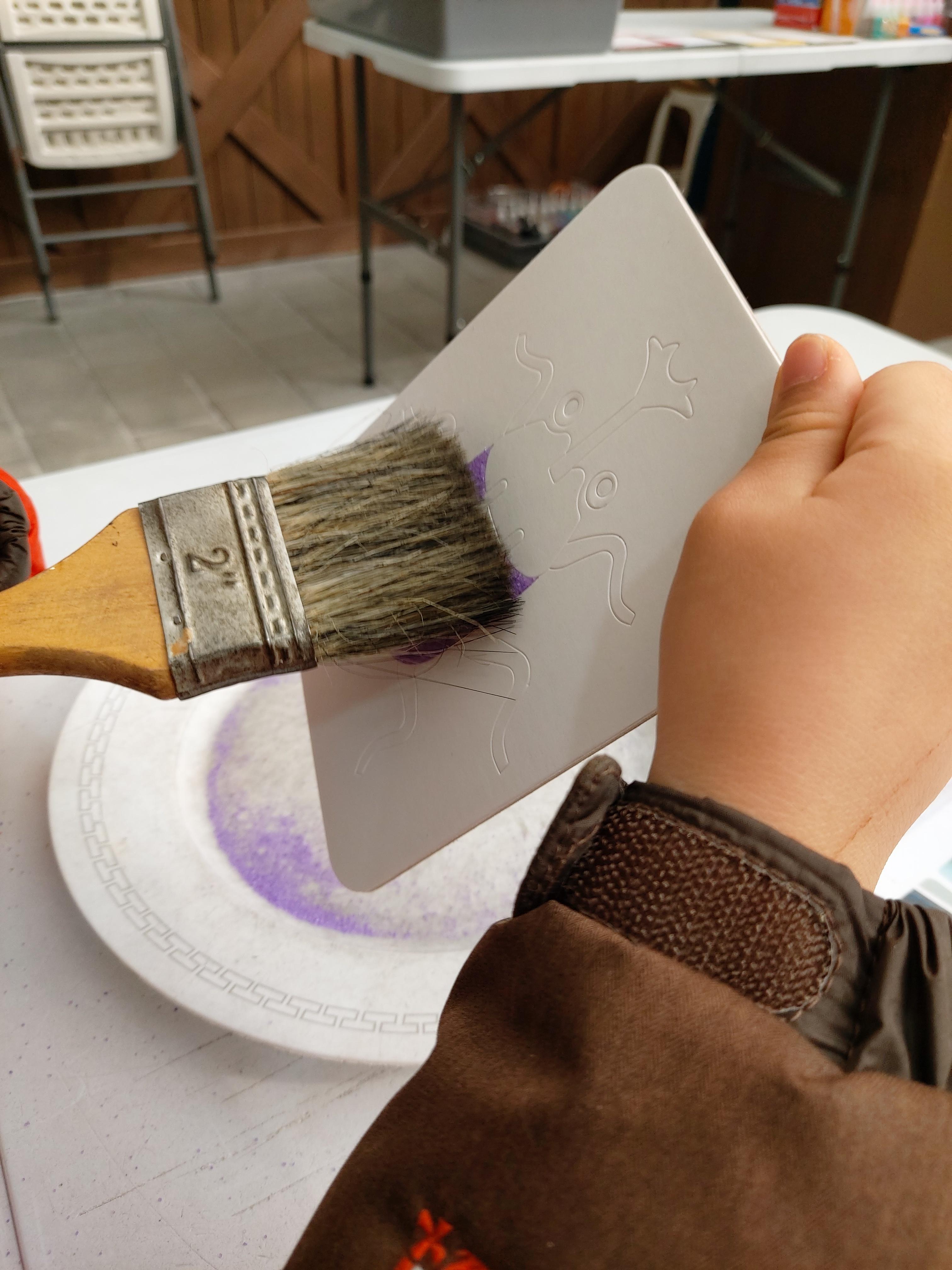 그리고 원하는 색깔의 모래를 촥촥 뿌려주고, 손으로 꾹꾹 눌러줍니다. 마지막으로 붓으로 살살 털어주면 됩니다.