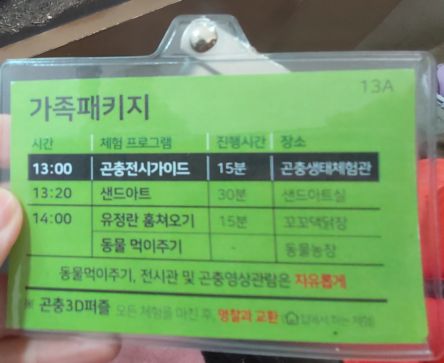 입장 후 아래와 같은 명찰을 주십니다. 체험 프로그램 순서를 참고하여 움직이시면 됩니다. 그리고 나중에 집에 가기전에 명찰을 반납하시면 곤충 3D퍼즐을 주십니다.