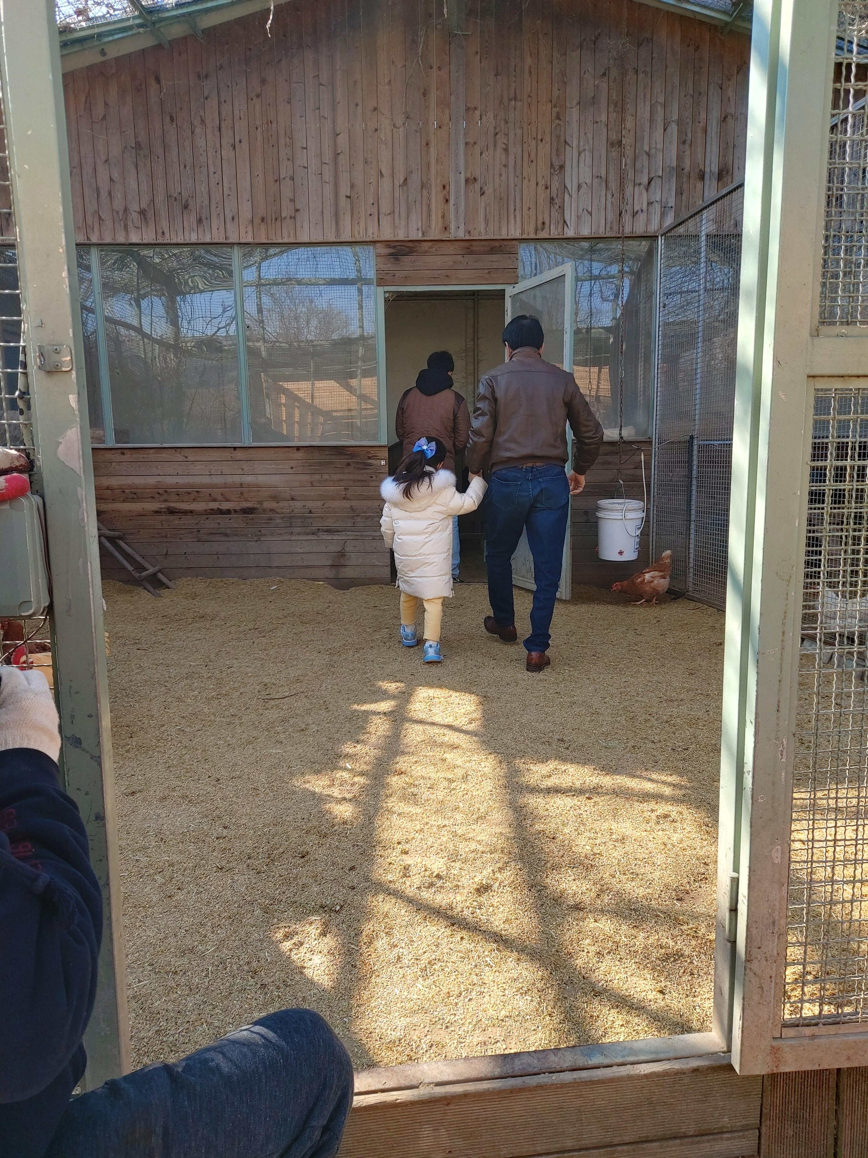 부모가 먼저 닭장에 들어가 왼쪽 한켠에 있는 사료통에 옥수수를 마구 뿌려댑니다. 그랬더니 수십마리 닭들이 일제히 사료통을 향해 달려옵니다. 그 틈을 타, 아이는 안쪽 우리에 있는 유정란을 훔쳐서 케이스에 담아 나오면 됩니다.