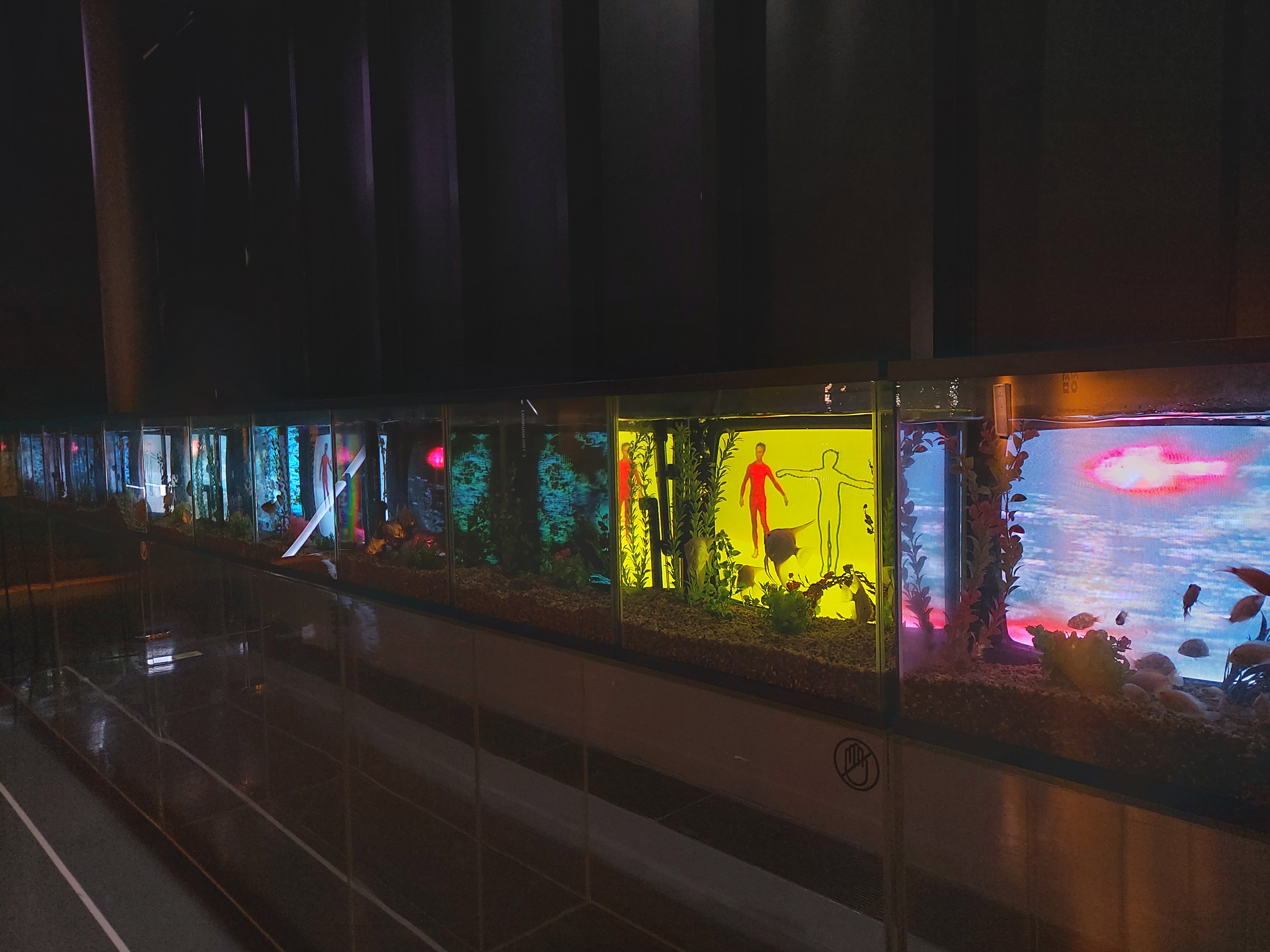 2층으로 올라가는 계단 입구에 TV 물고기(비디오 물고기)가 전시되어 있습니다.