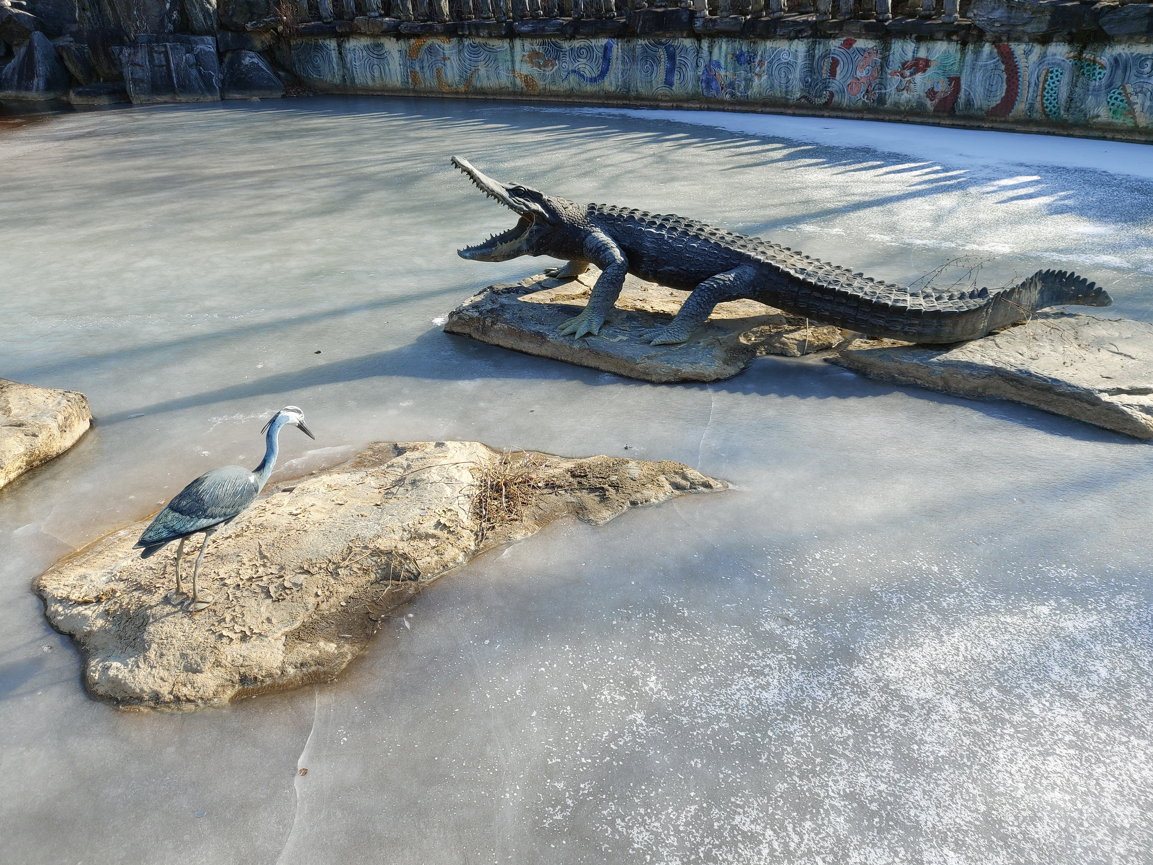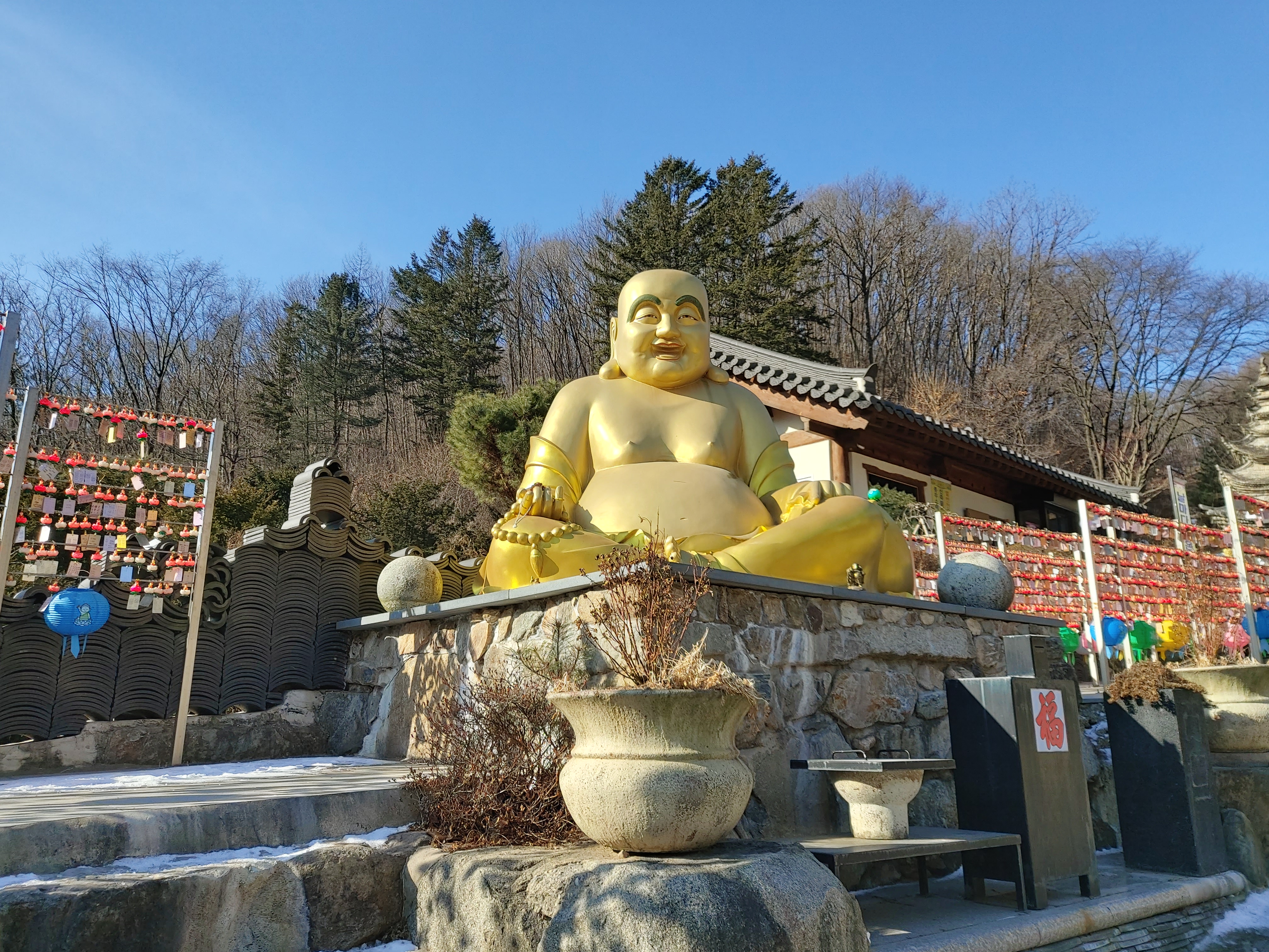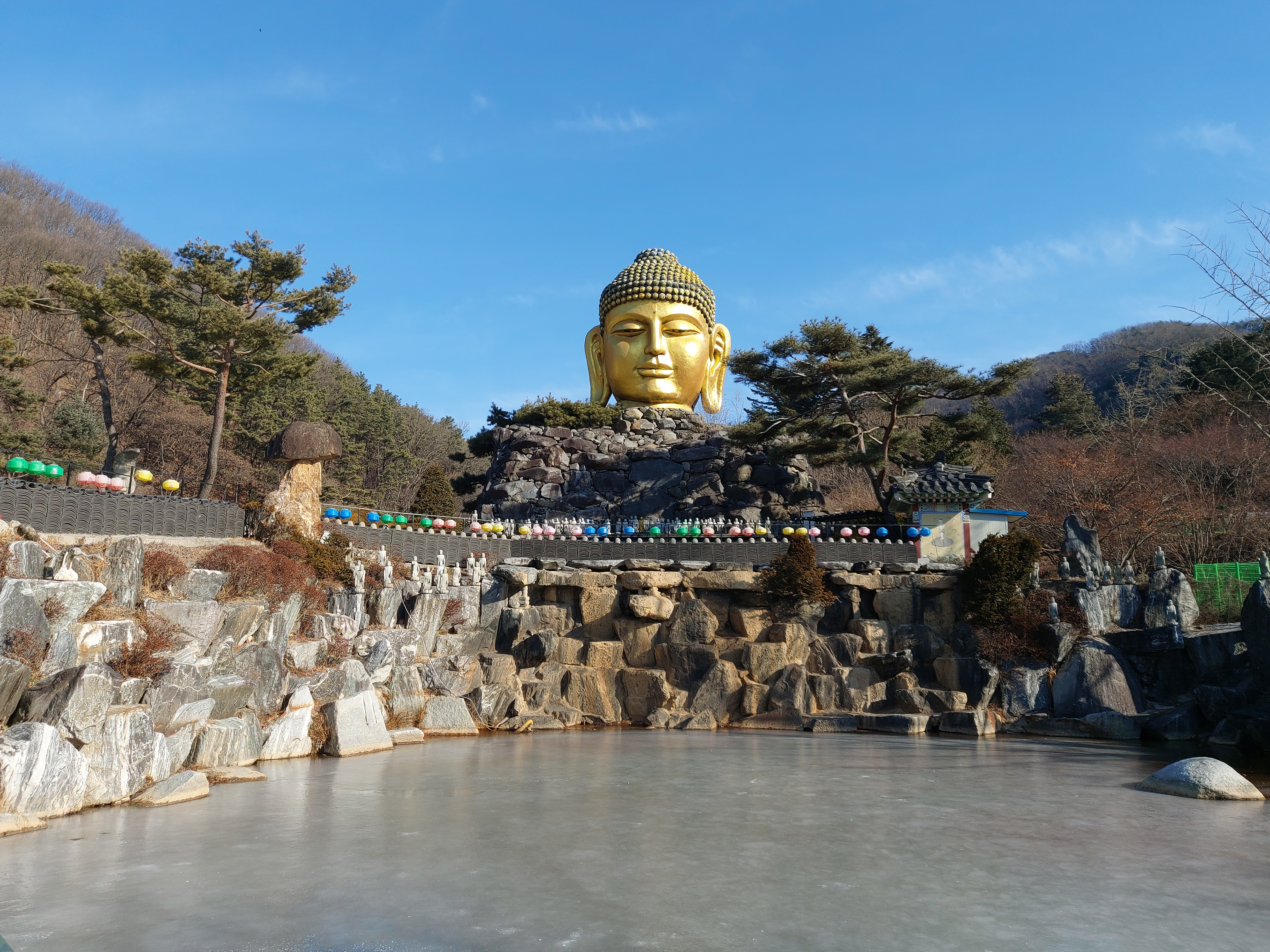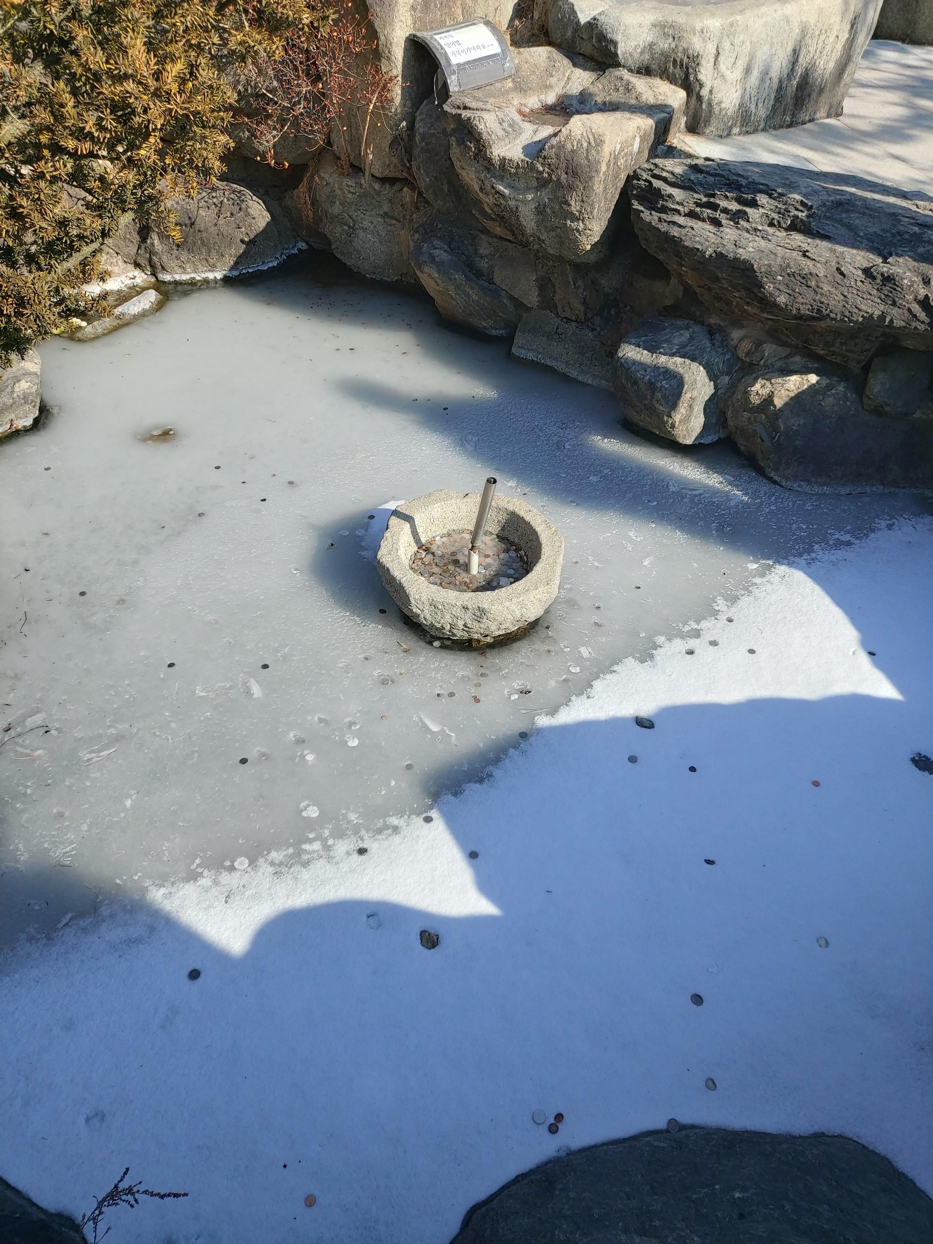 불두 주변 곳곳에 소원을 빈 흔적이 보이네요. 지금은 연못이 얼어있는데, 날이 풀리면 연못의 물고기에게 밥도 주고 그러나봐요.