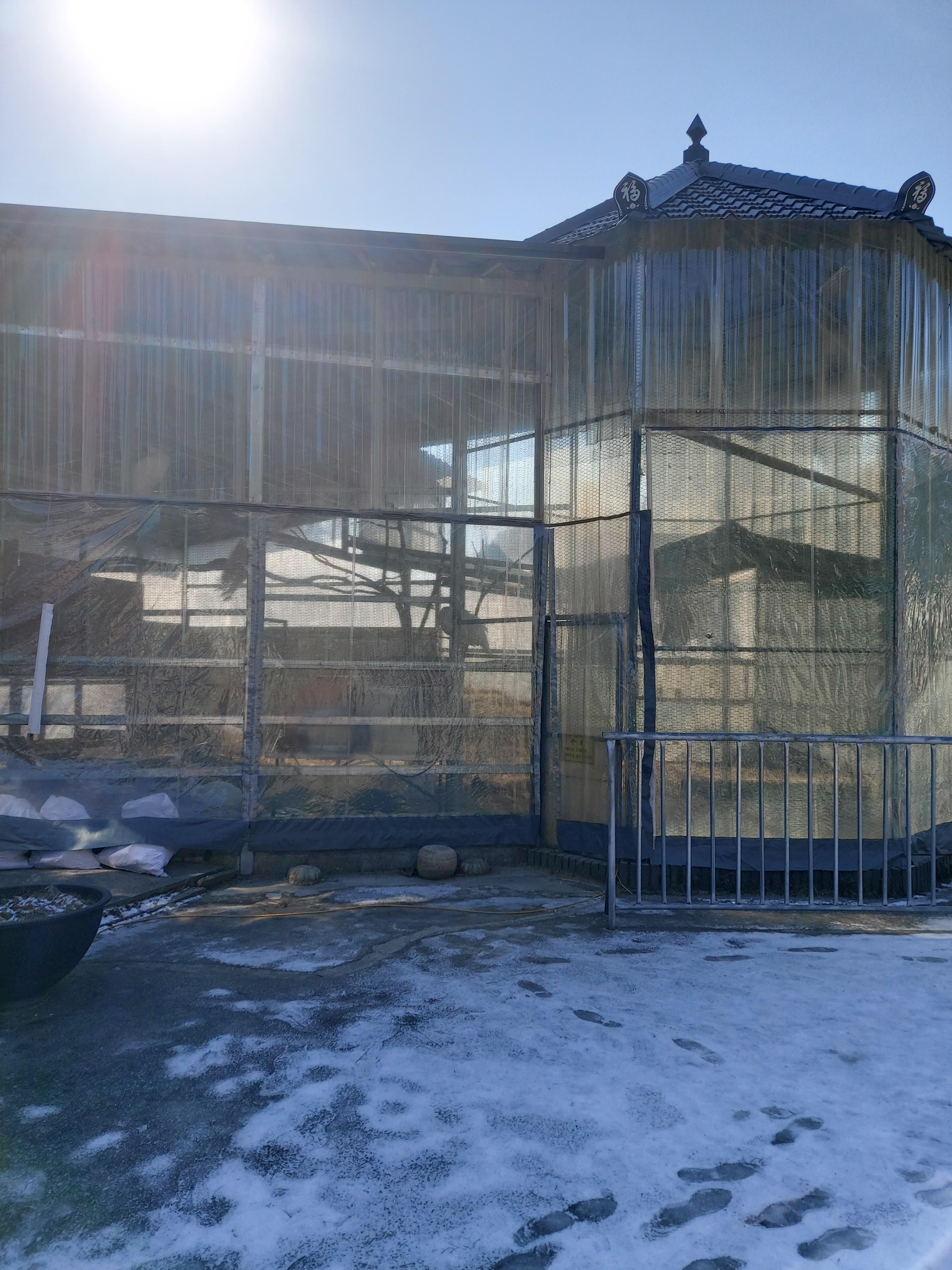 내려와서 주차장 한 켠에 공작새 우리도 있더라고요.