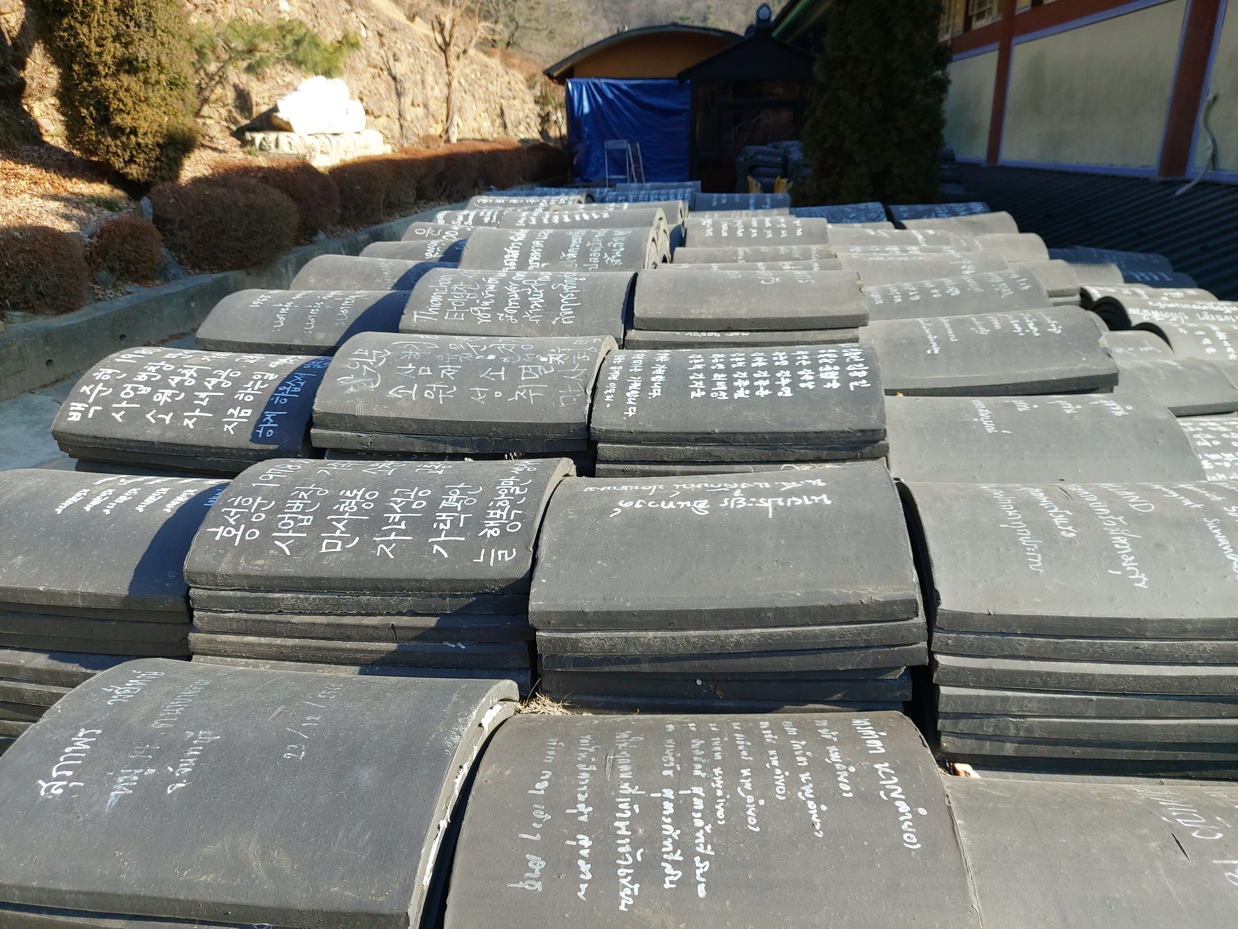기왓장에도 소원을 적어 놓았네요. 한글 말고도 여러 외국어가 적혀있는 것을 보니, 외국인 관광객이 와우정사를 많이 찾는 것 같습니다.