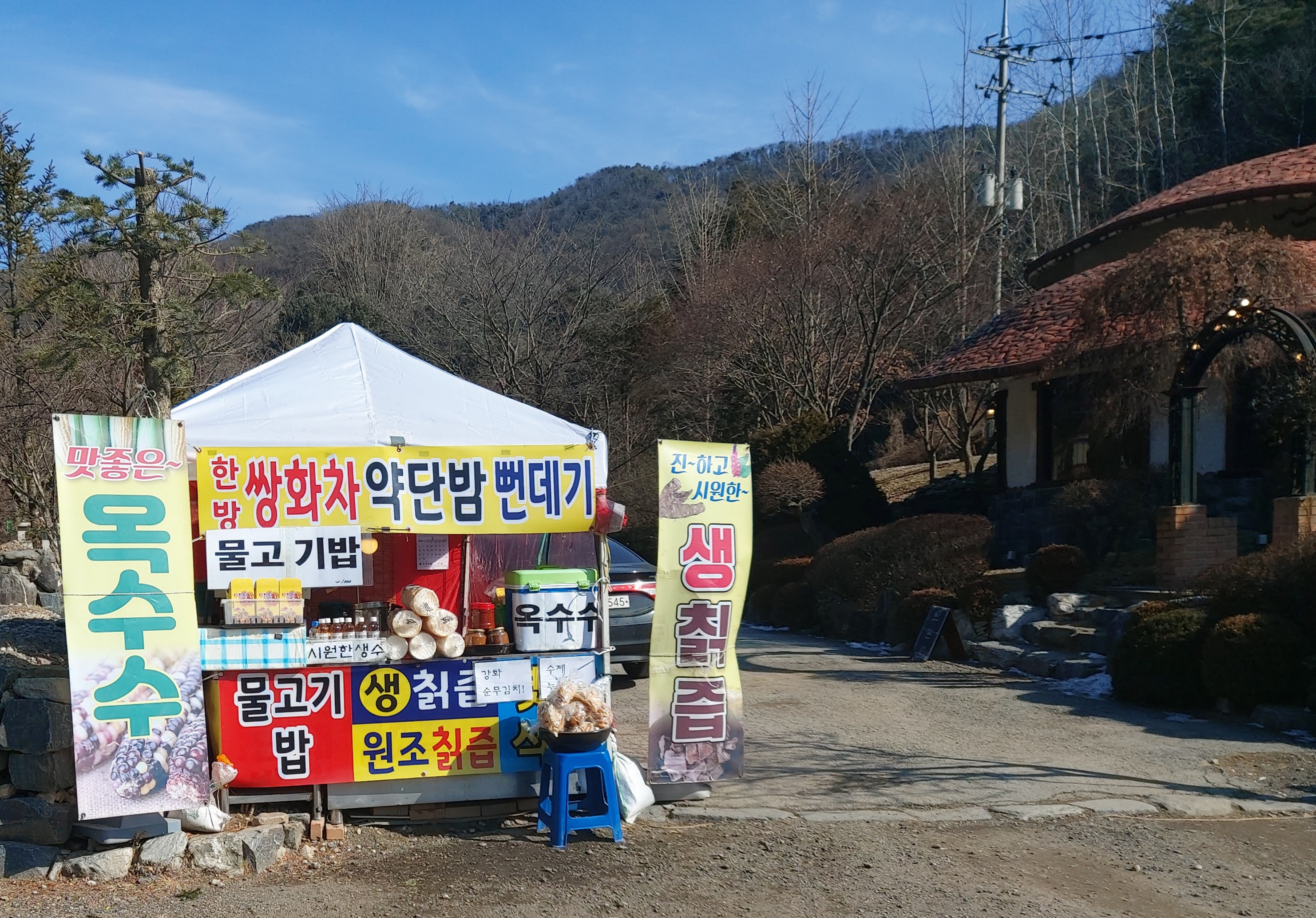 주차장 입구에 약단밤과 옥수수, 음료 등을 팔고 있더라고요. 맞은 편에는 구멍가게 같은 것도 있습니다.
