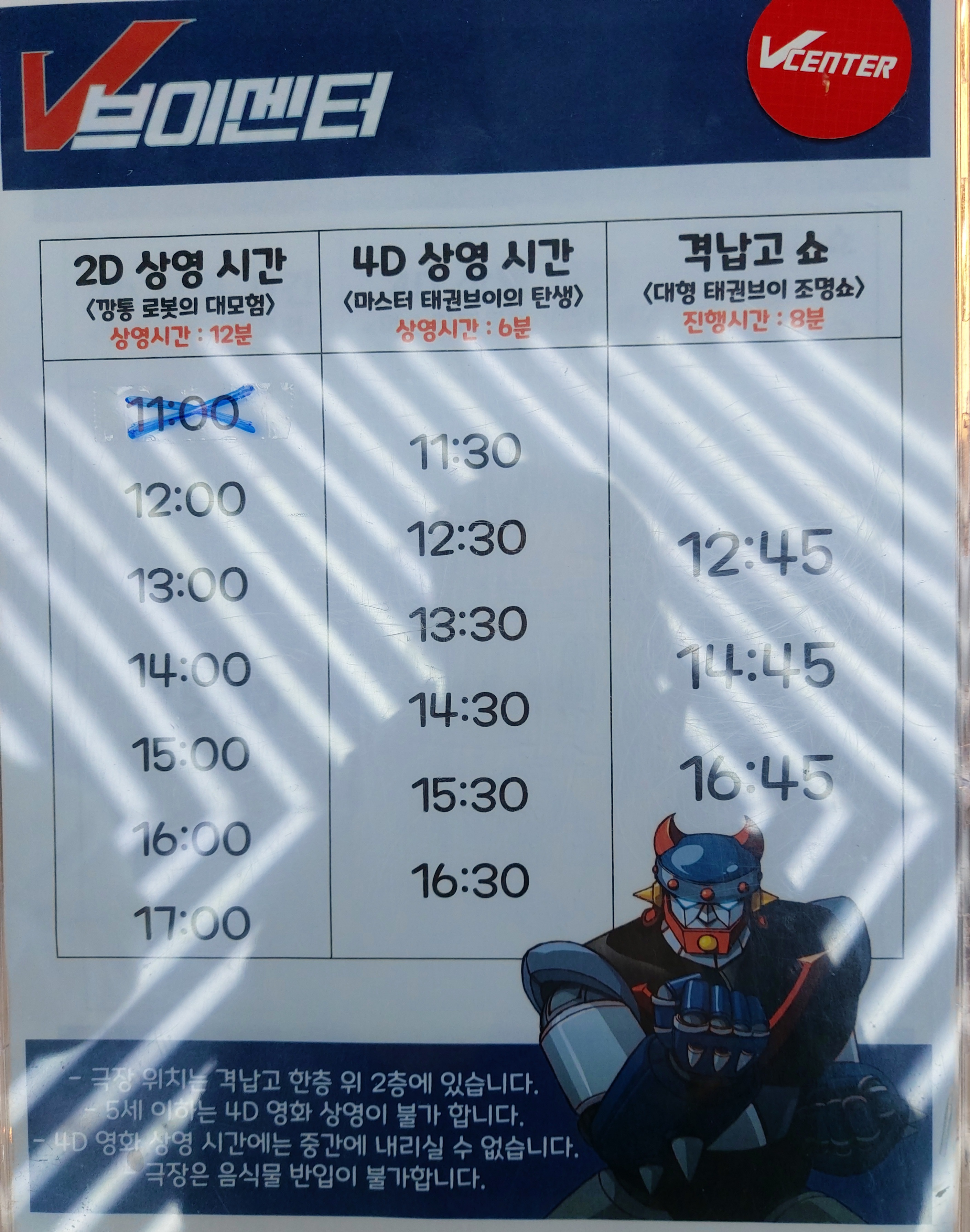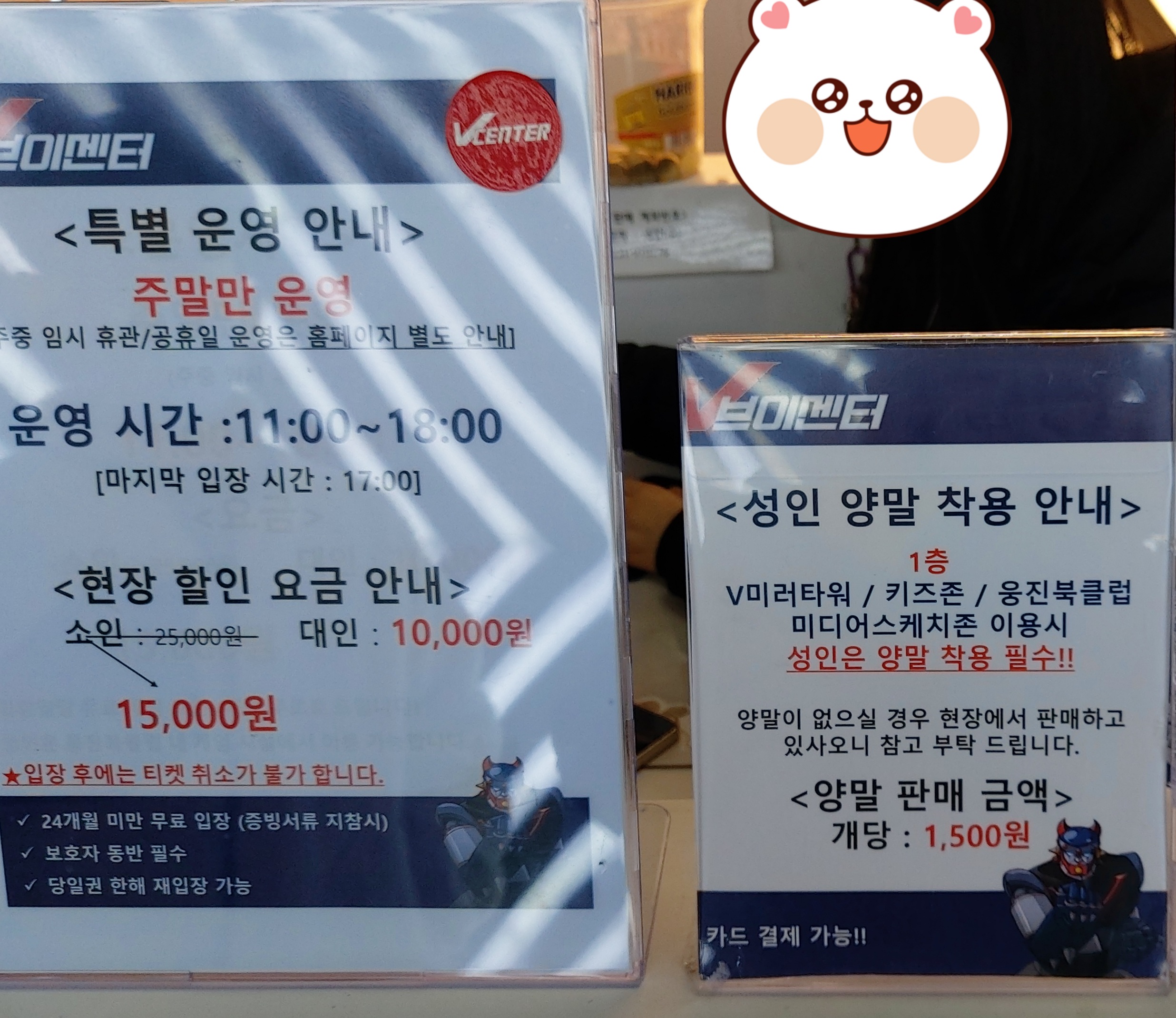 브이센터 운영시간은 11시~18시이고, 마지막 입장시간은 17시 입니다.