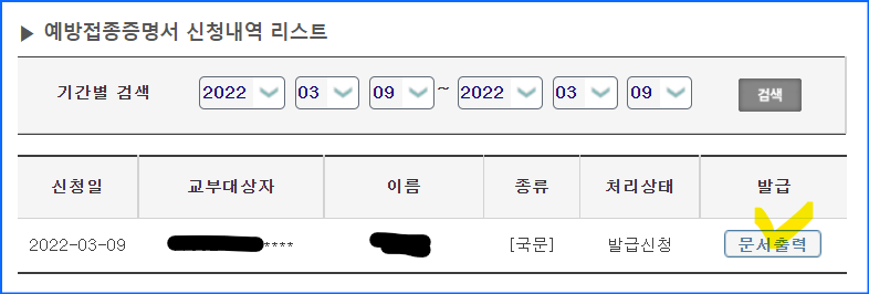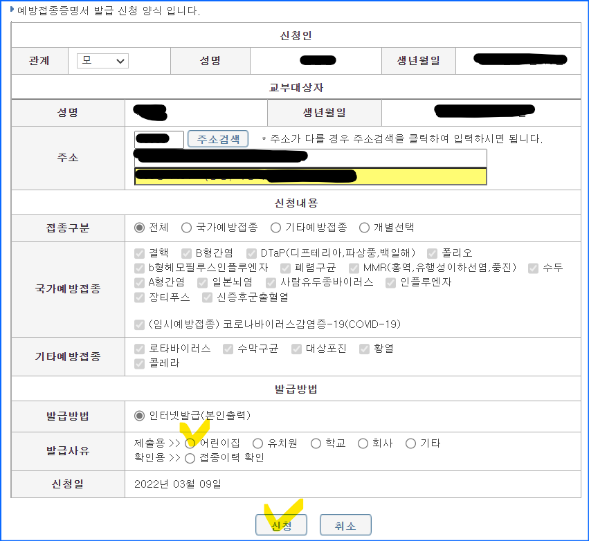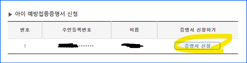 아이 예방접종증명서 신청이 뜹니다.