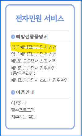 3. 왼쪽 카테고리에서 국문 예방접종증명서 신청을 클릭합니다.