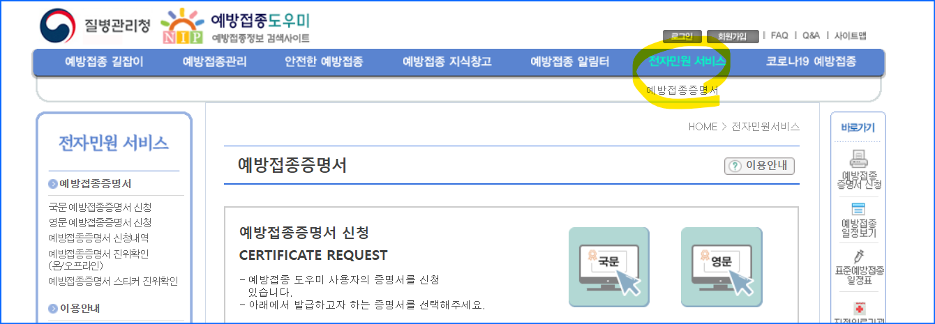 예방접종 도우미 > 전자민원서비스 > 예방접종증명서