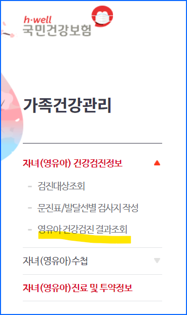 3. 영유아 건강검진 결과조회를 클릭합니다.