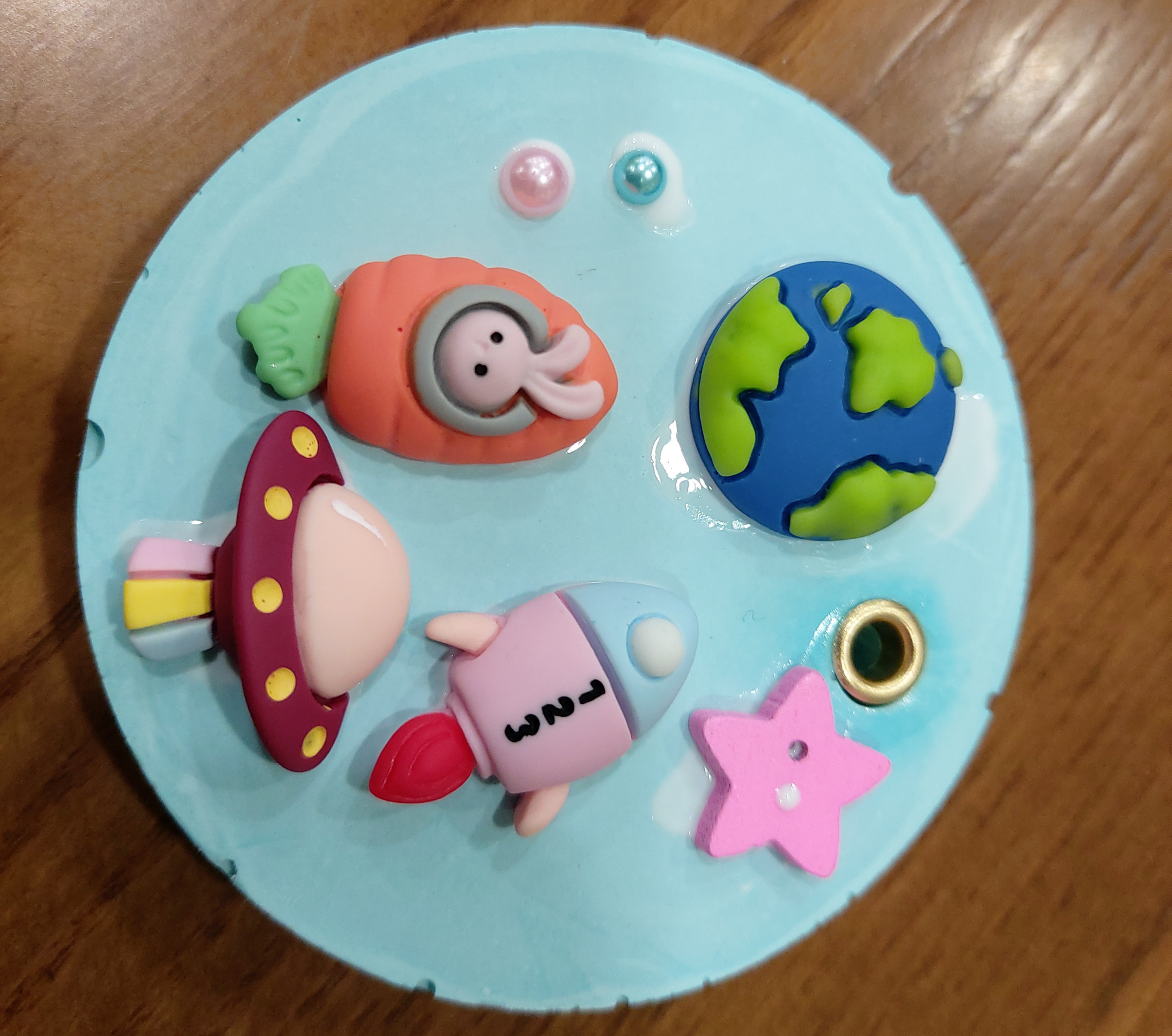 4. 굳은 석고 틀에 우주 장식을 목공 본드를 이용해서 붙여줍니다.