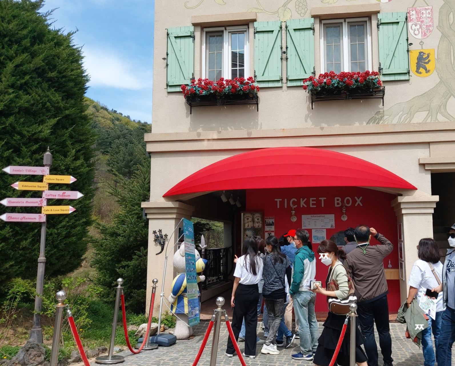이제 예쁜 건물에 빨간색 매표소에서 티켓을 구매하시면 됩니다.