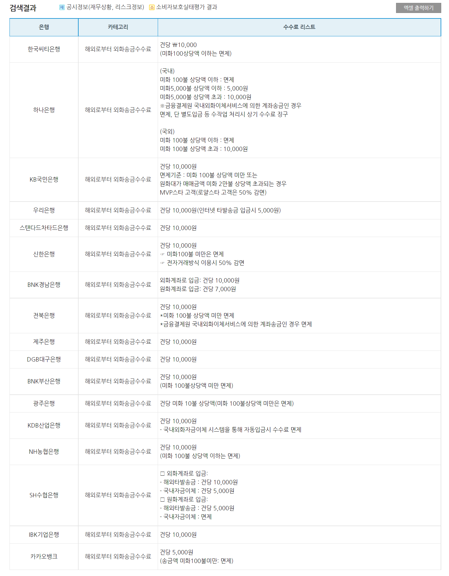 한국씨티은행, 하나은행, 신한은행, KB, NH농협, 카카오뱅크 같은 경우는 미화100불미만은 수수료가 면제네요.