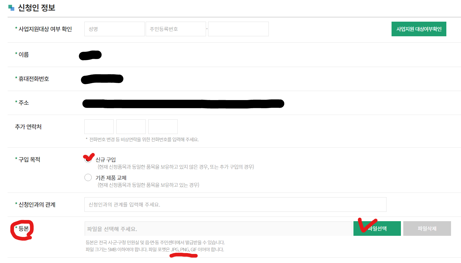 7. 신청인 정보를 입력하세요. 그리고 등본을 첨부하셔야 합니다. 등본은 '정부24'사이트에서 온라인으로 발급받으시면 됩니다.