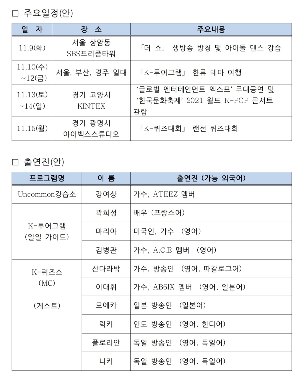 주요일정 및 출연진