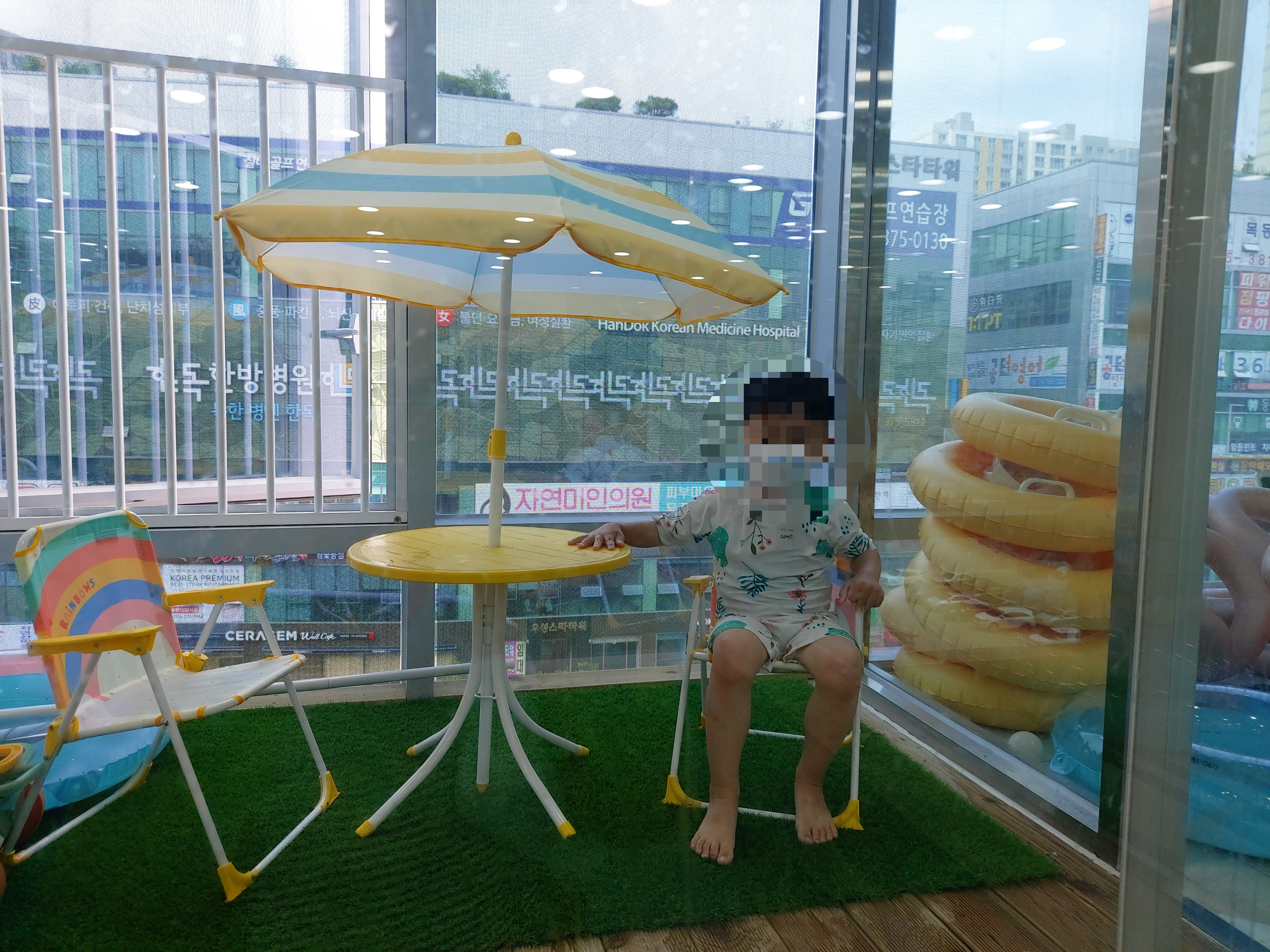 물놀이 종료 후, 샤워하기 전에 잠시 파라솔에 앉아서 한 컷 찍었습니다.