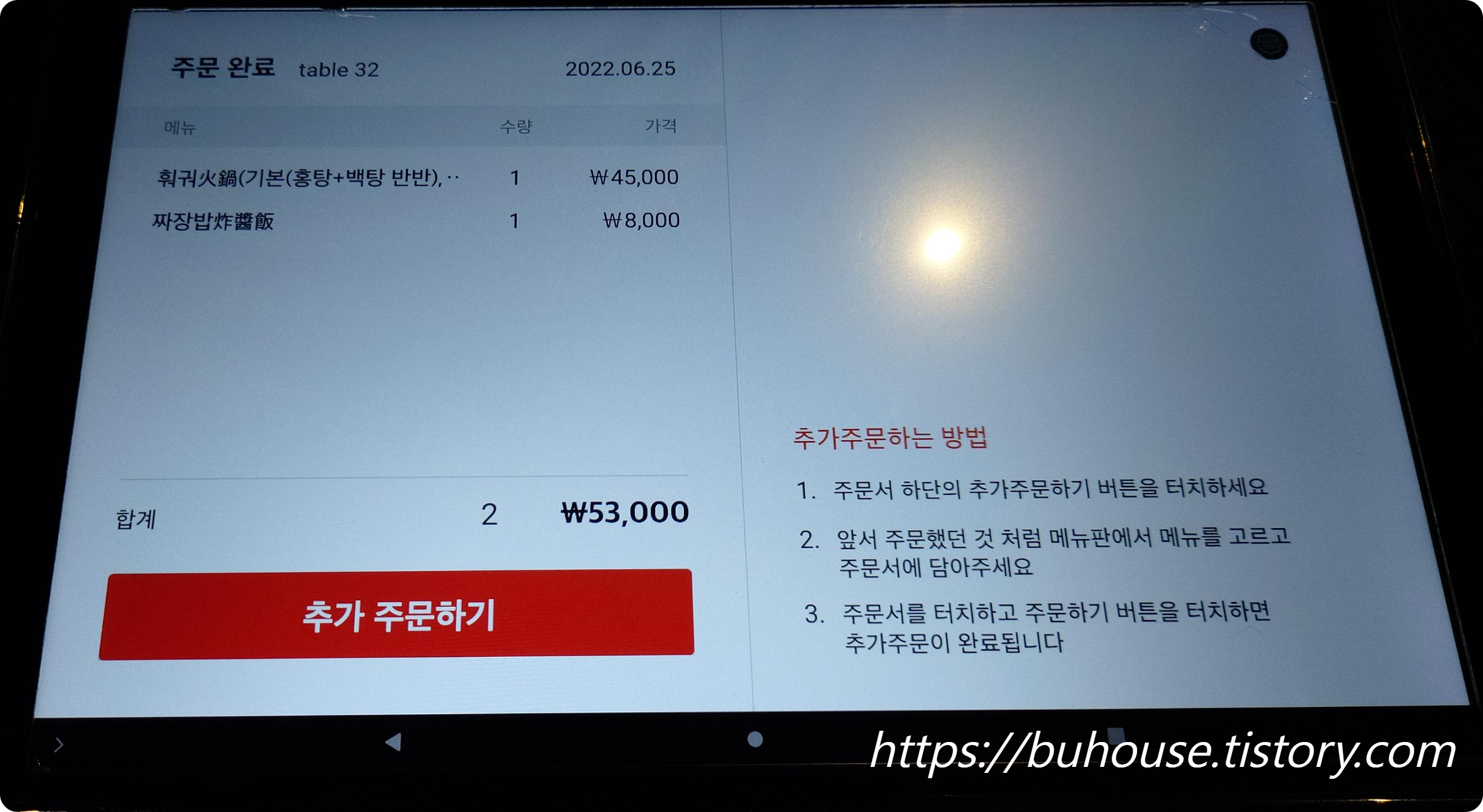 저는 홍탕과 백탕이 반반으로 나오는 훠궈를 주문했습니다. 45000원이고요 2인분이라고 보시면 됩니다. 테이블마다 놓인 테블릿으로 직접 주문을 넣으시면 됩니다.