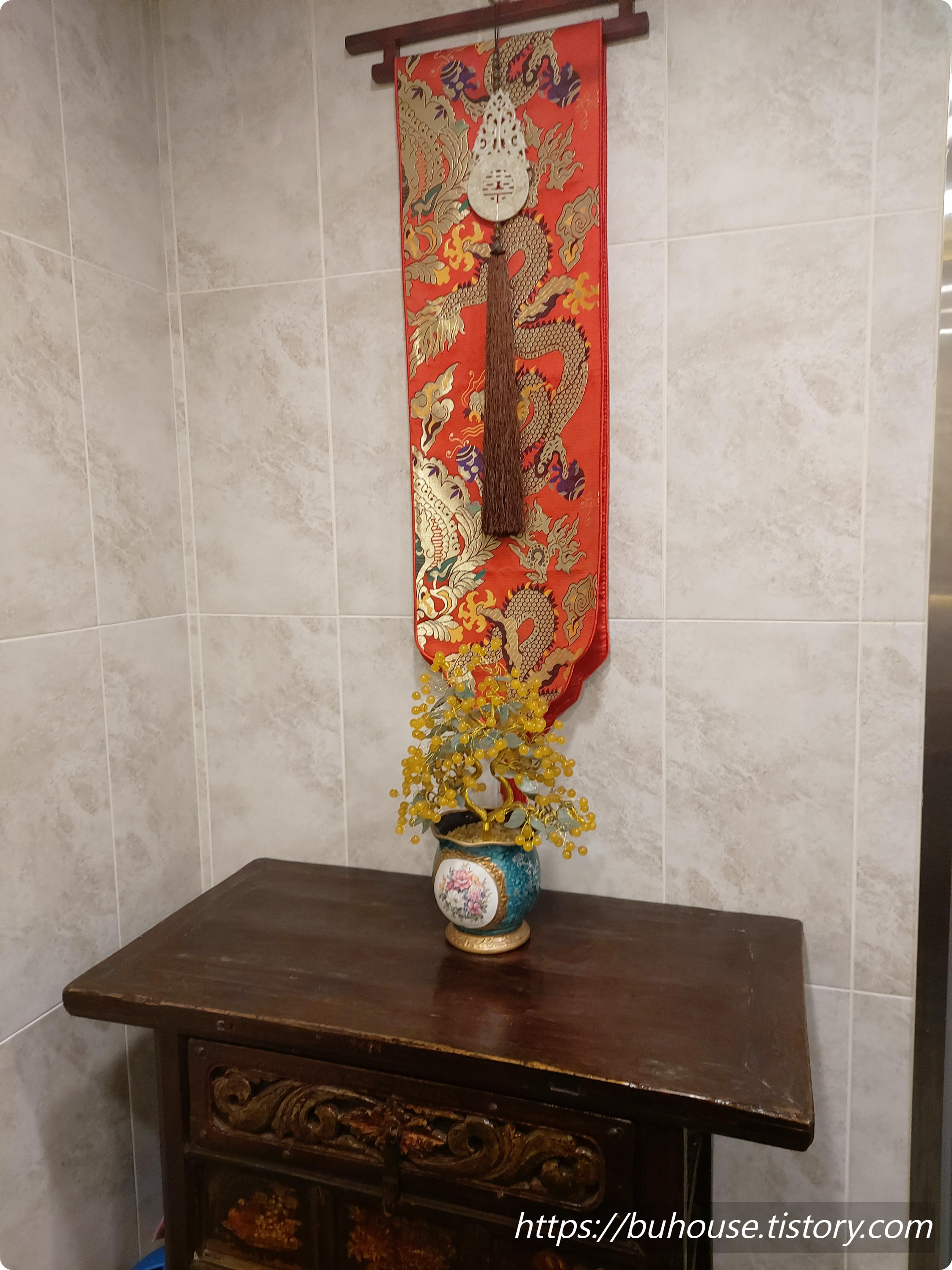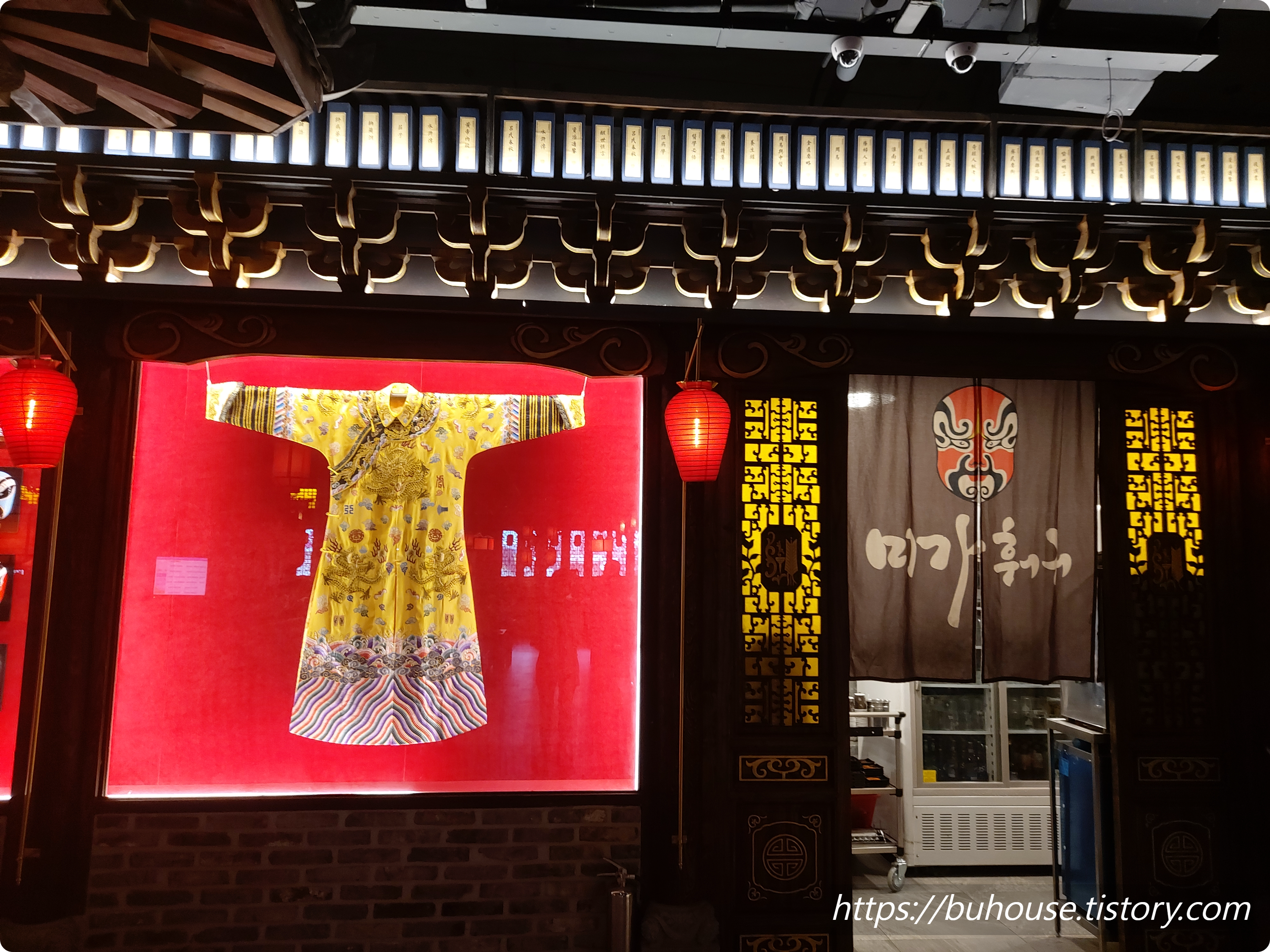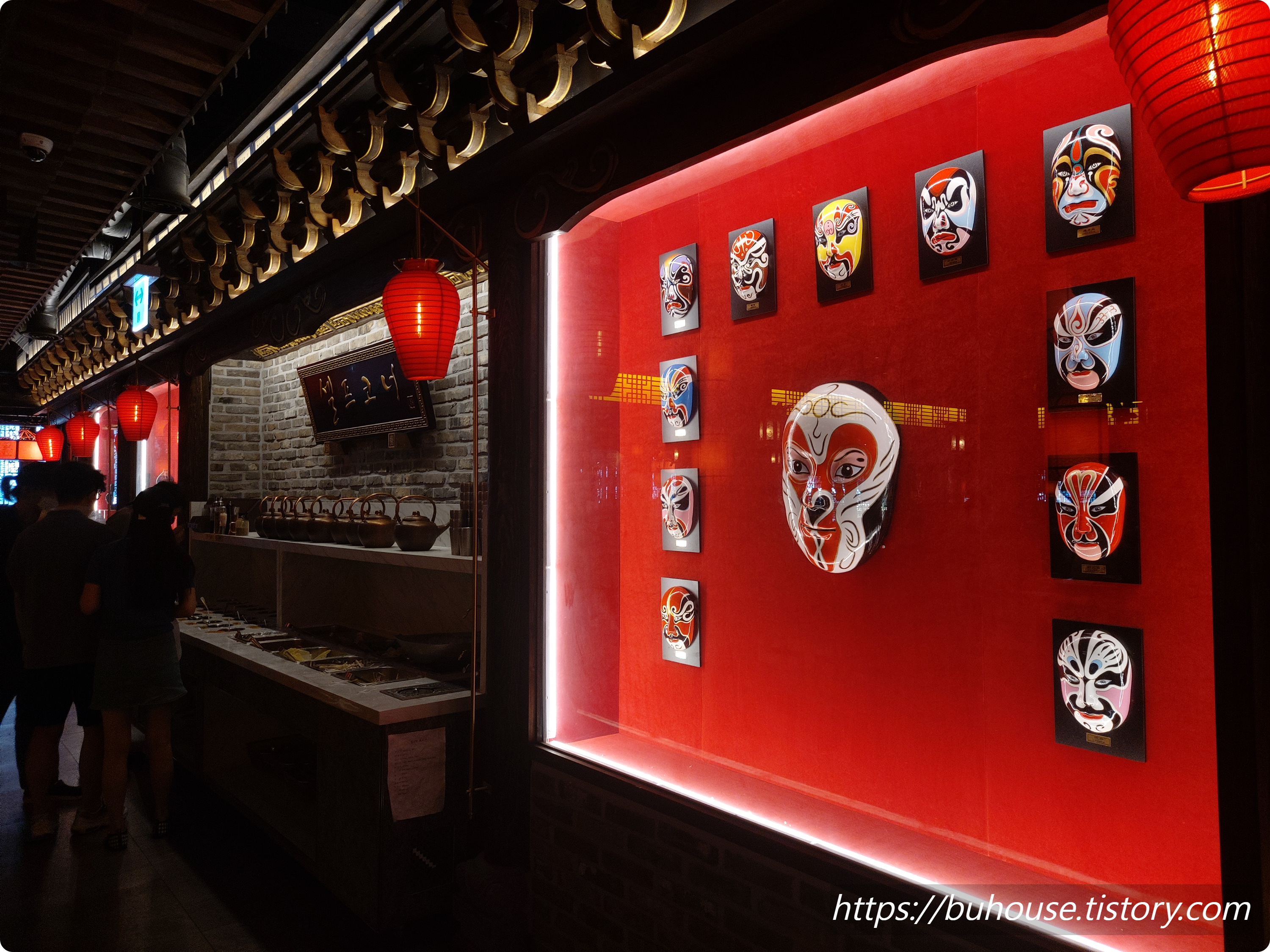 중국 의복과 중국가면(변검) 등이 인테리어 효과를 주고있네요.