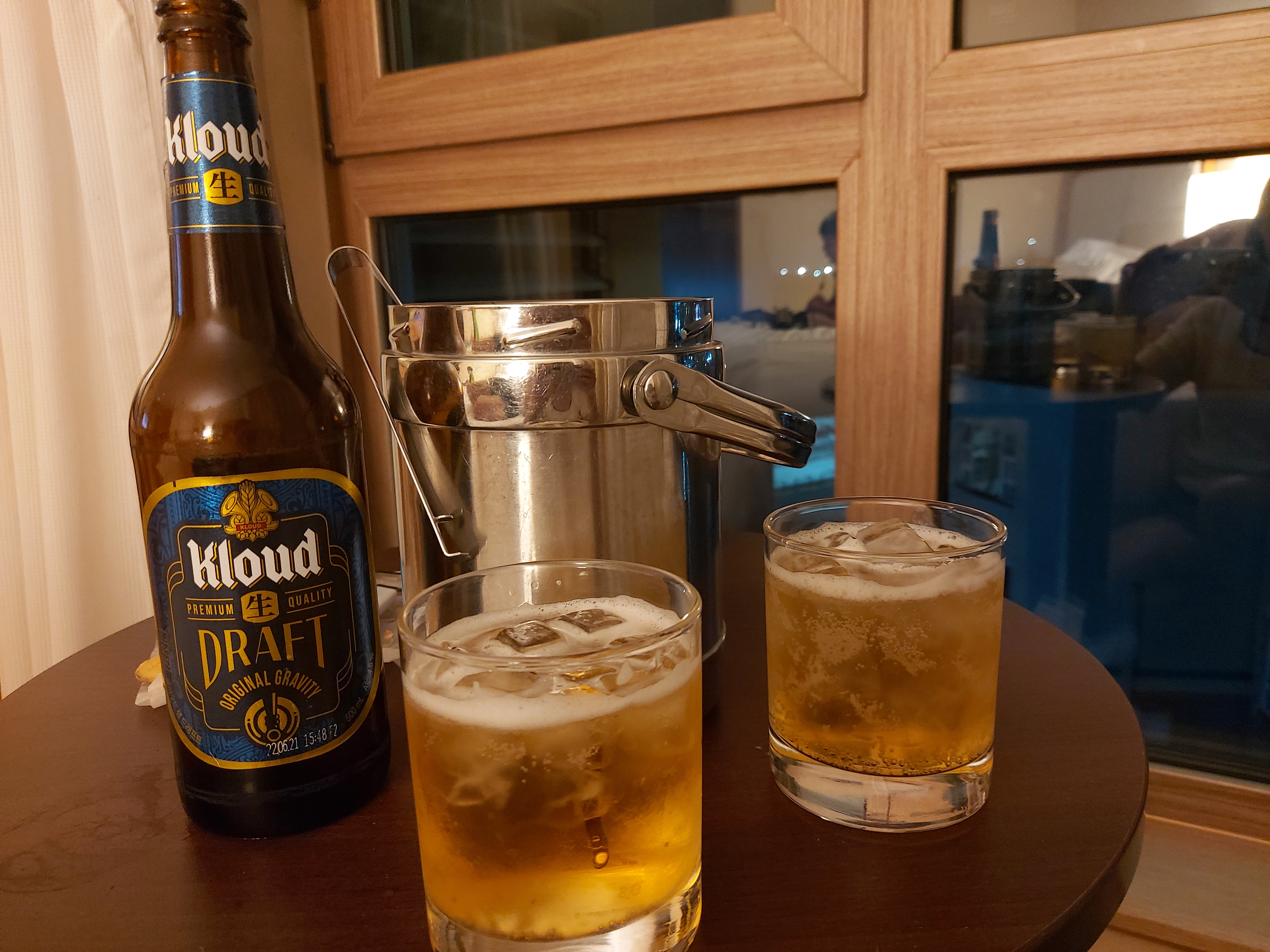맥주에 얼음 동동 시원하게 즐기고 있습니다.