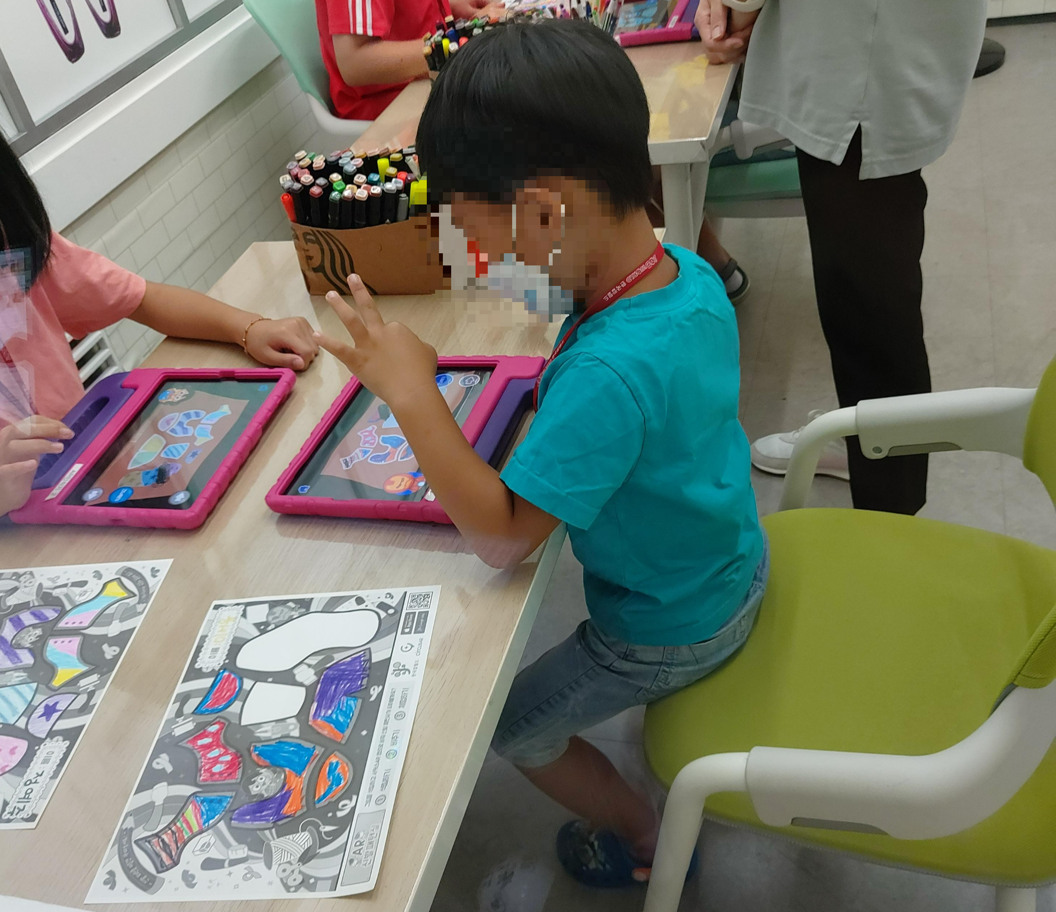 패턴으로 신발을 만드는 체험을 하는 것인데, 종이에 채색을 하고 태블릿으로 찍으면 자동으로 신발을 제작해 주는 AR 기술과 결합된 체험이었습니다.