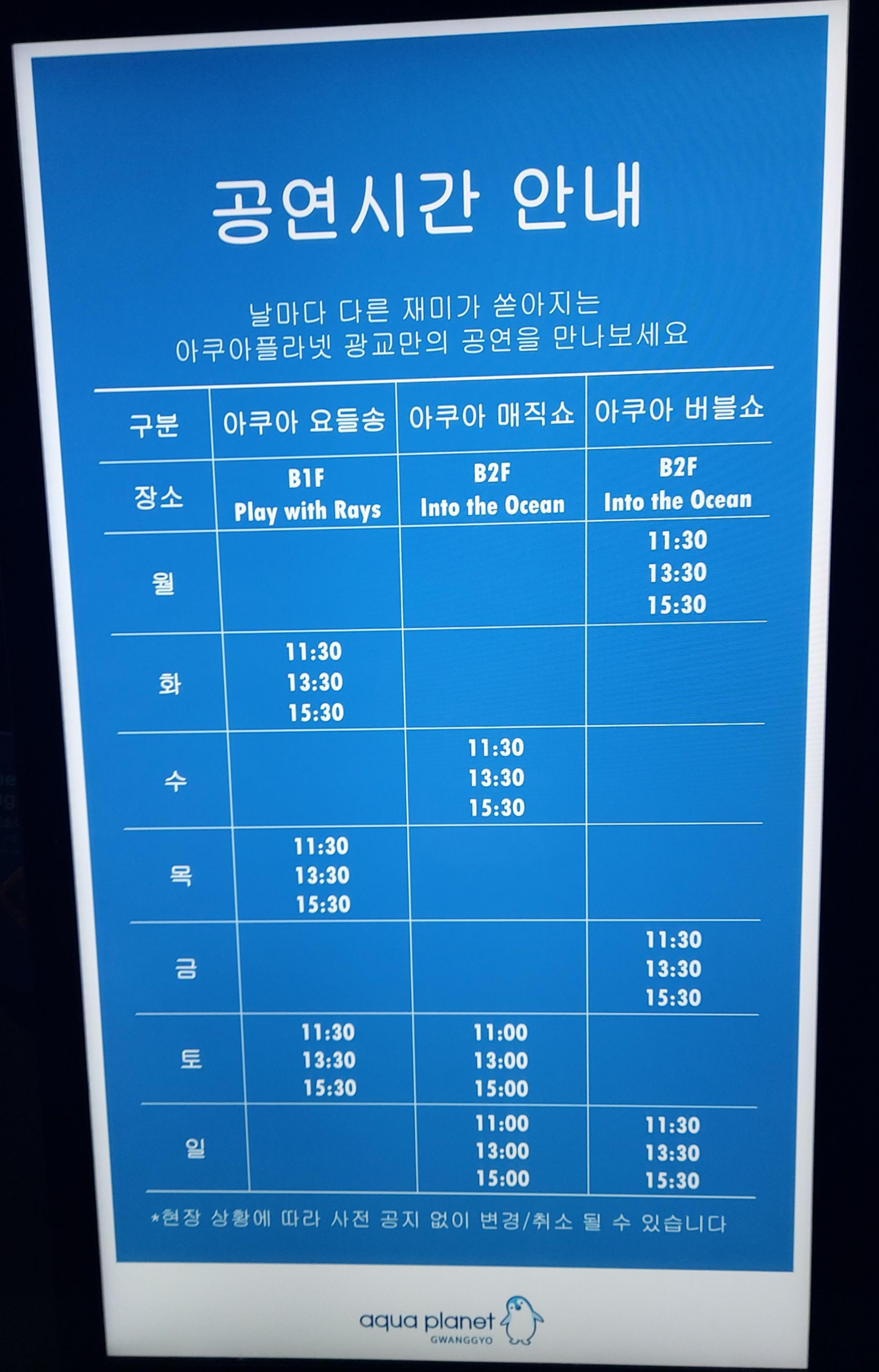 요일별로 진행되는 프로그램의 시간과 장소를 확인하세요. 저는 아쿠아매직쇼를 관람했었는데 아이들이 참 좋아했었어요.