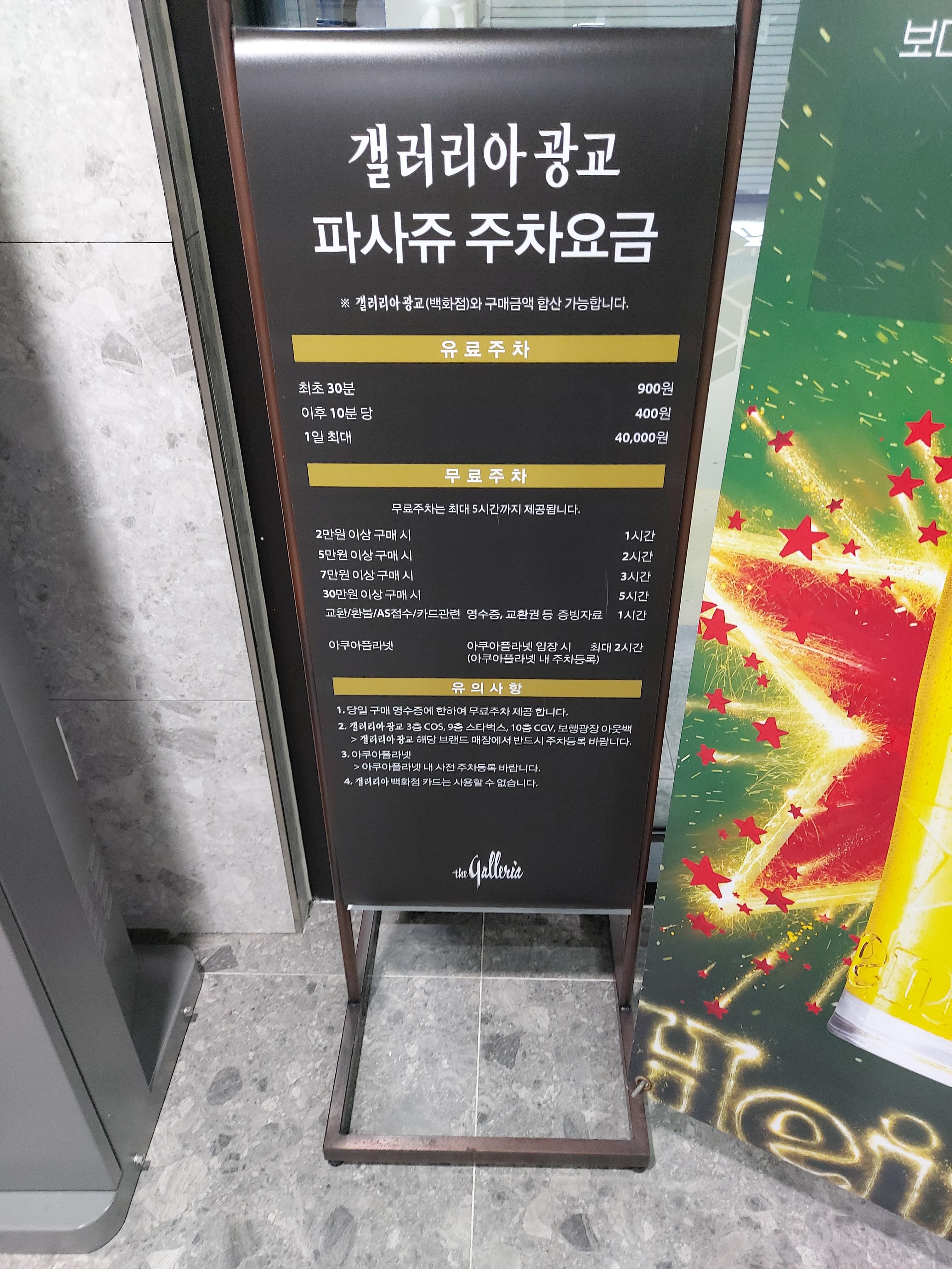주차 요금은 일단 아쿠아플라넷에서 주차등록하시면 2시간 공제해 줍니다. 나머지는 갤러리아 식당이나 제품을 구매하시면 공제되는 형식입니다.