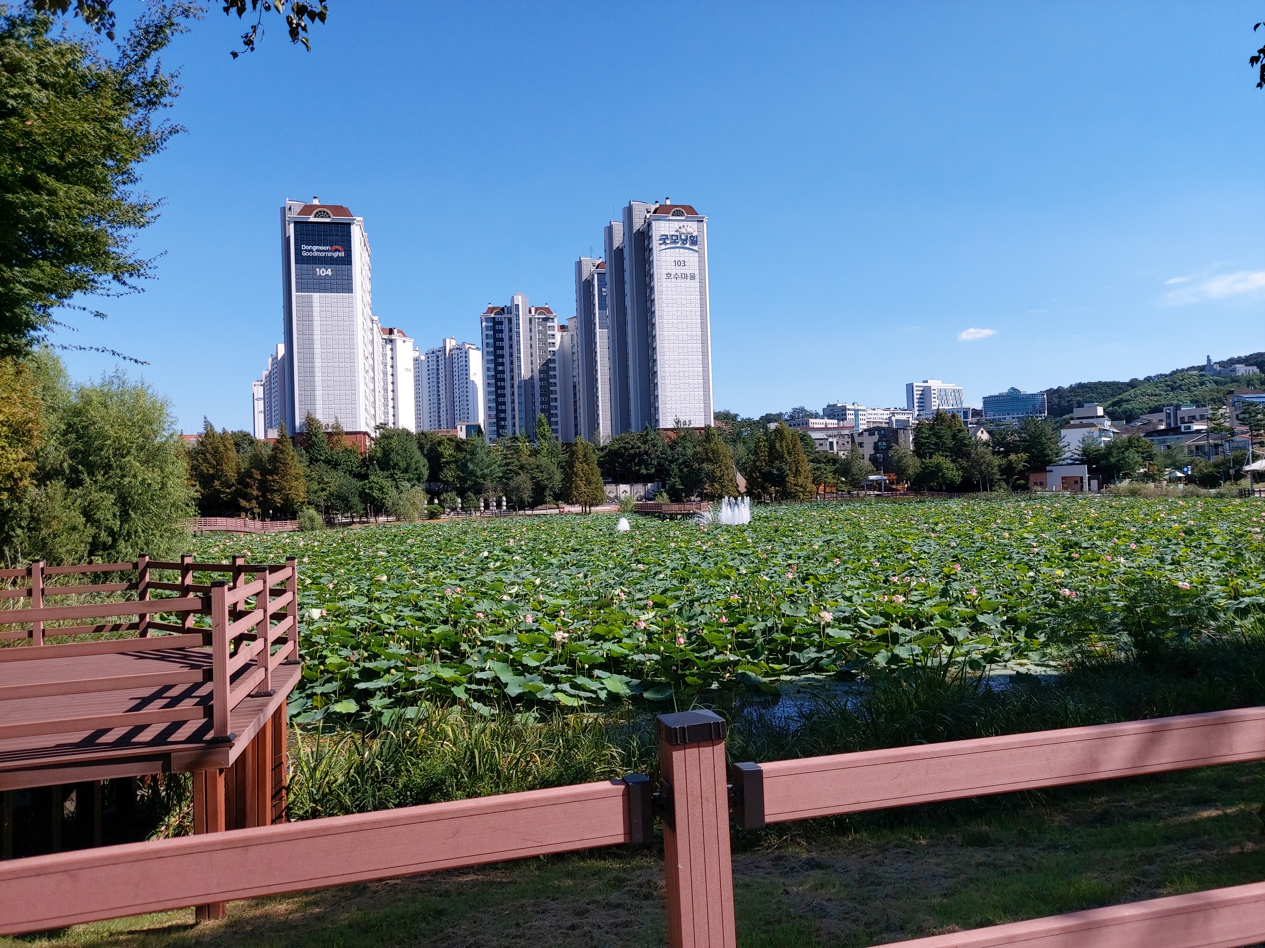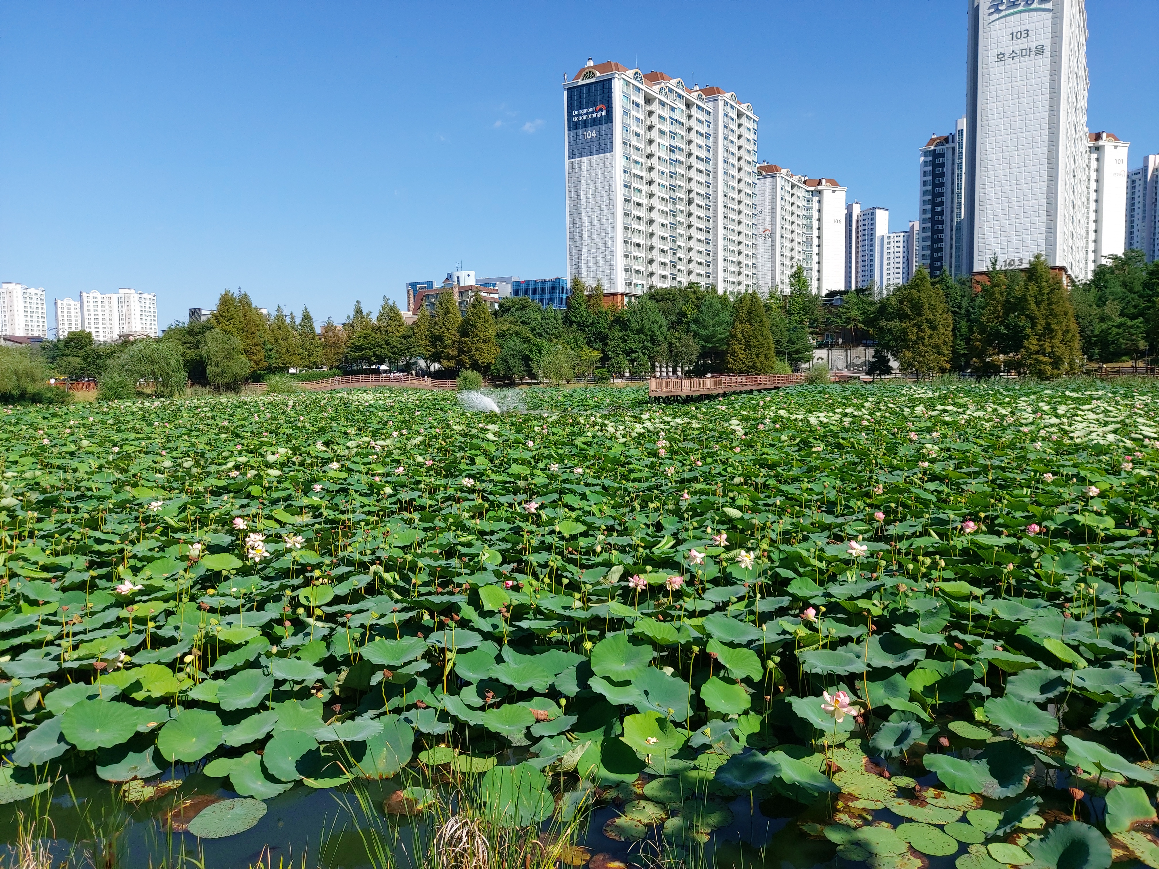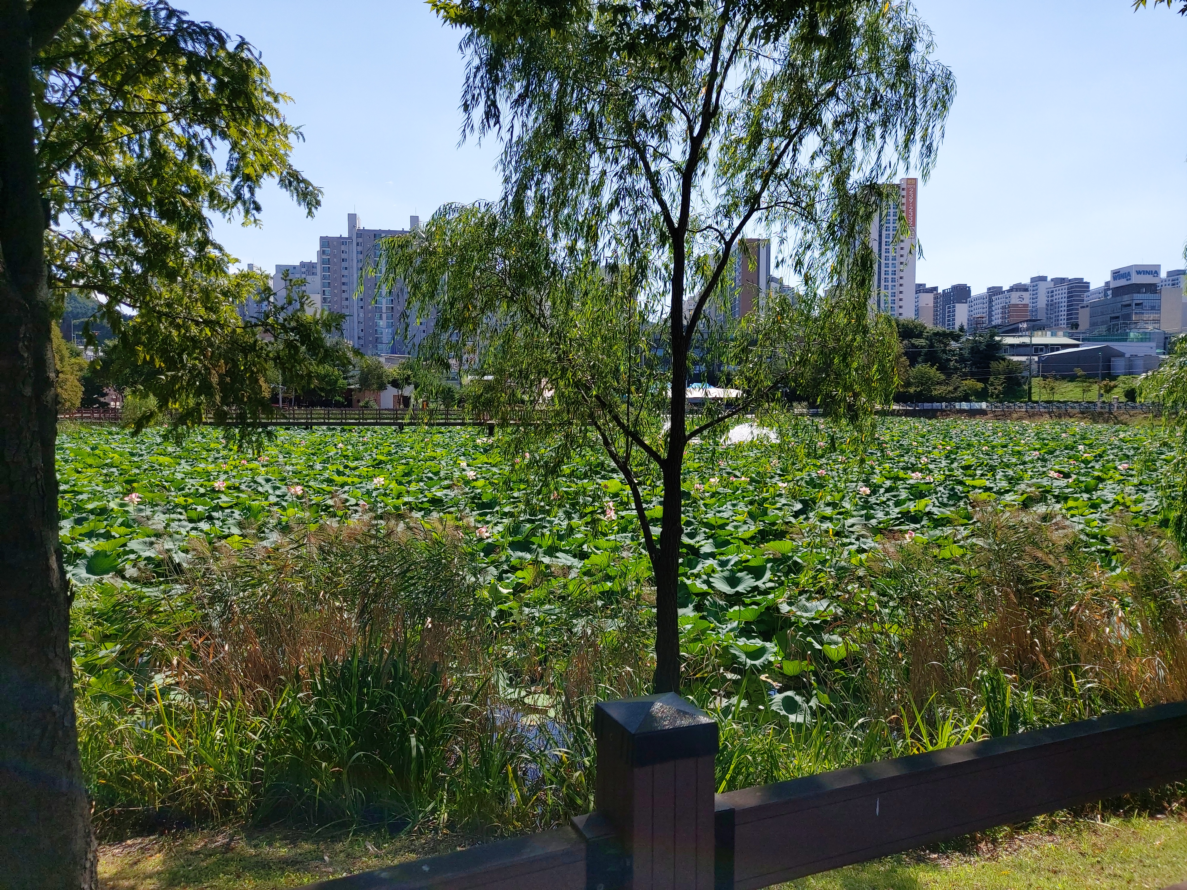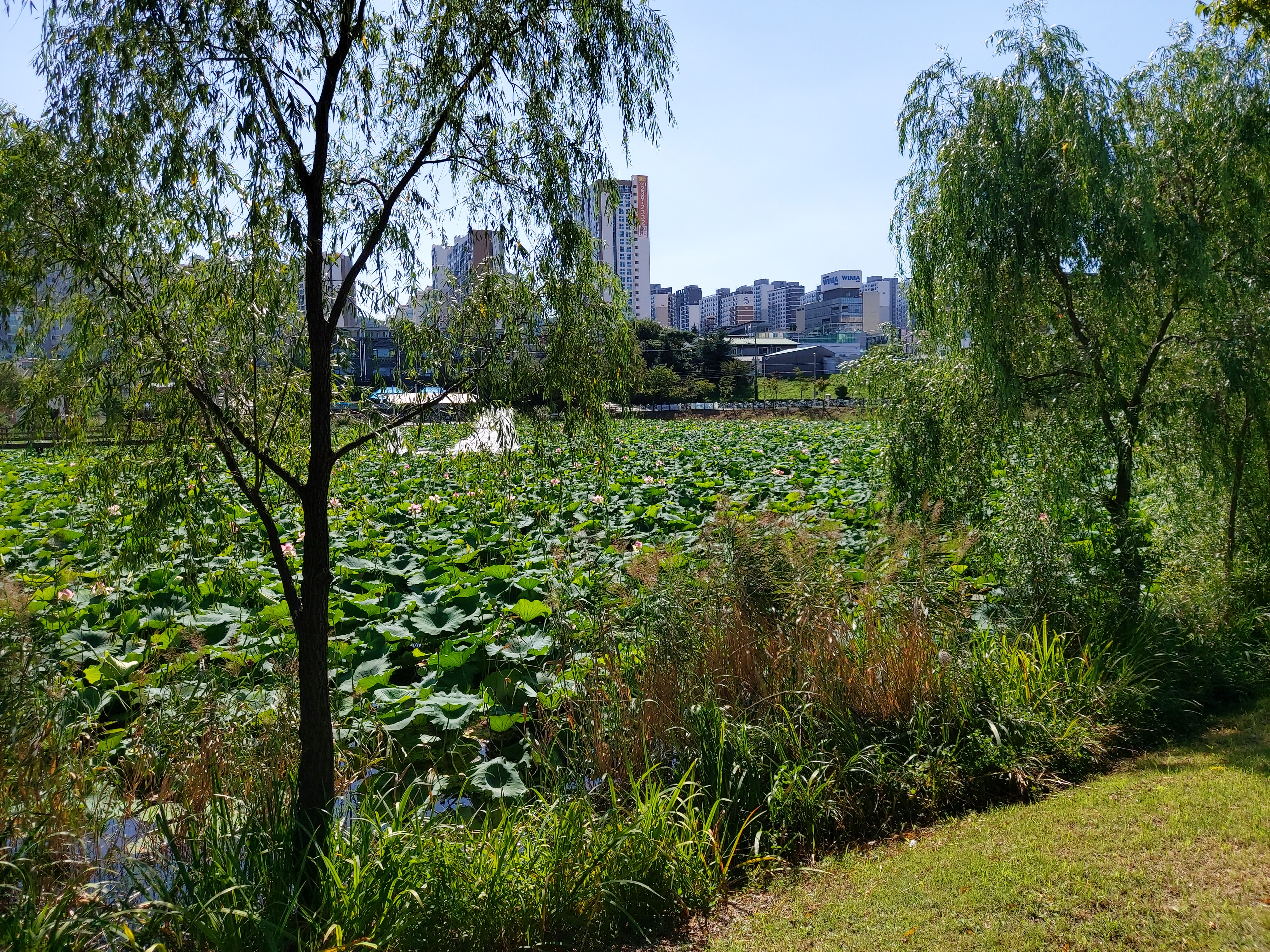 호수에 연꽃이 아주 많아서 꽃이 피면 너무 예쁠 것 같습니다.