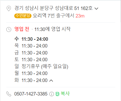 오리역 7번출구 바로 앞입니다. 매주 일요일은 정기휴무네요. 참고하세요.