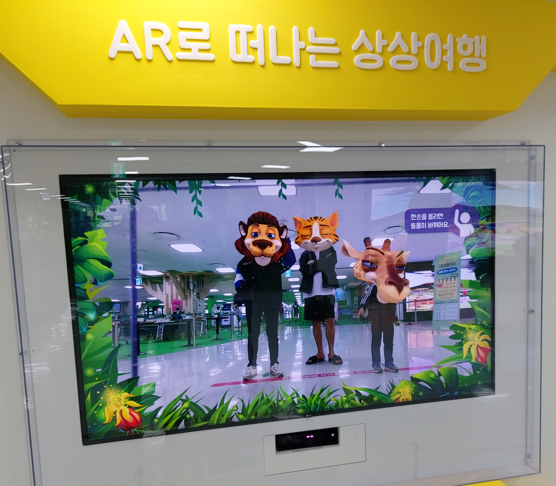 그 옆에는 AR로 떠나는 상상여행이라고해서, 화면 앞에 서면 얼굴이 동물로 바뀝니다. 한 손을 번쩍 치켜들면 다른 동물 얼굴로 변해요. 우리 아들이 너무 좋아했던 공간입니다.