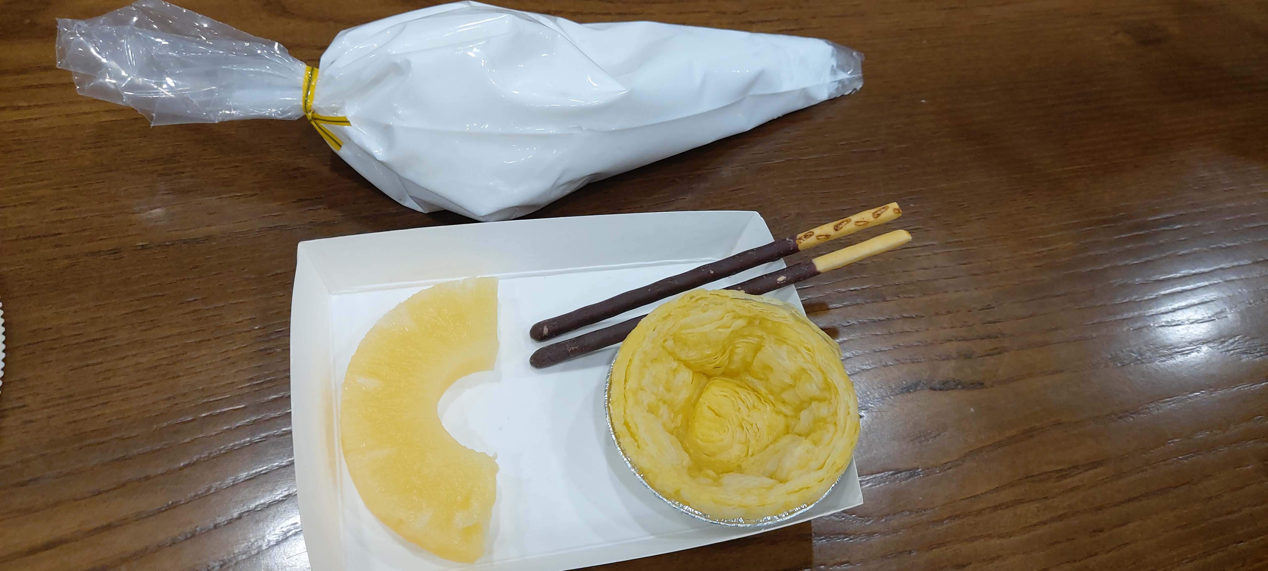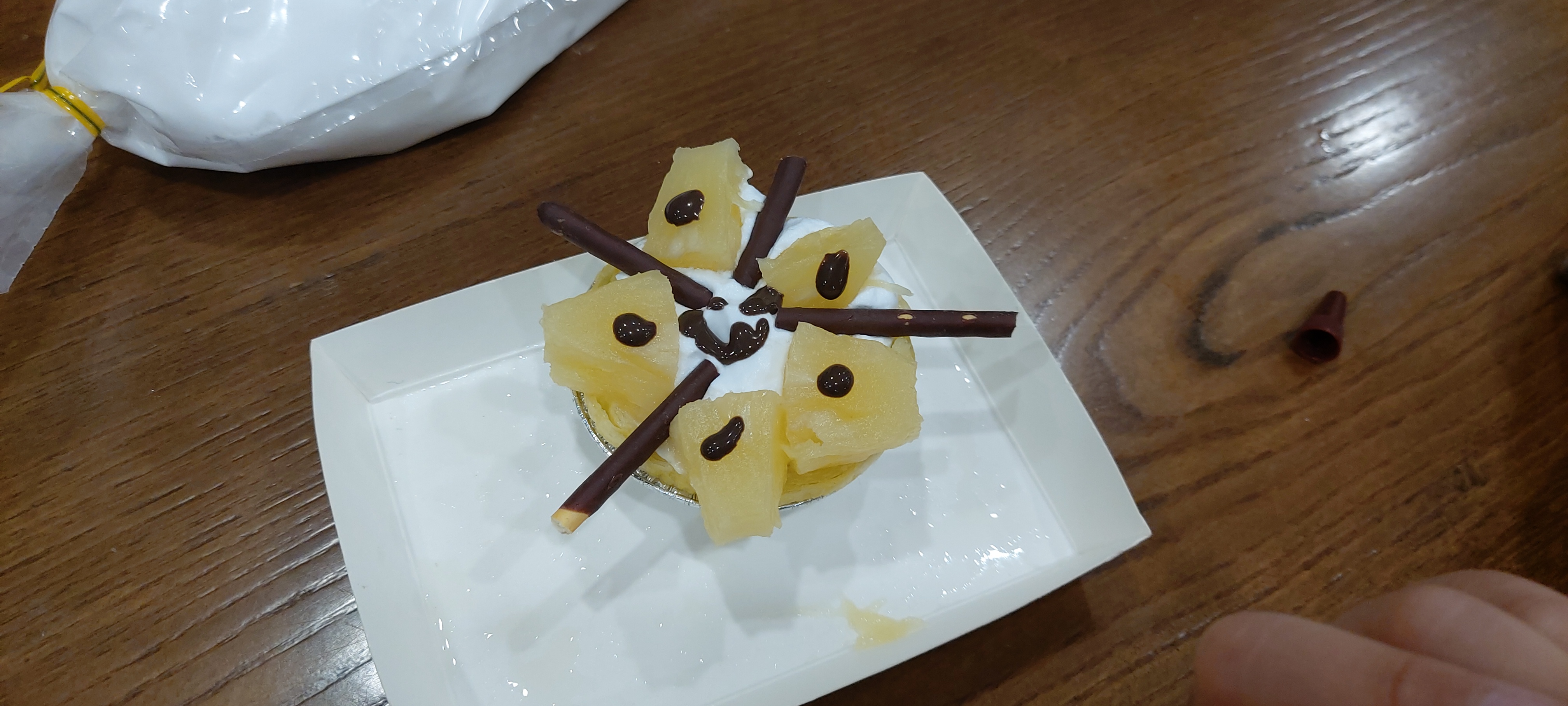 간단해요. 타르트에 생크림을 듬뿍 짜주고, 파인애플로 사자 갈귀를 표현해줍니다. 빼빼로를 잘라 사자 수염을 만들어주고 초코스틱으로 사자 눈,코,입을 표현해주면 됩니다.