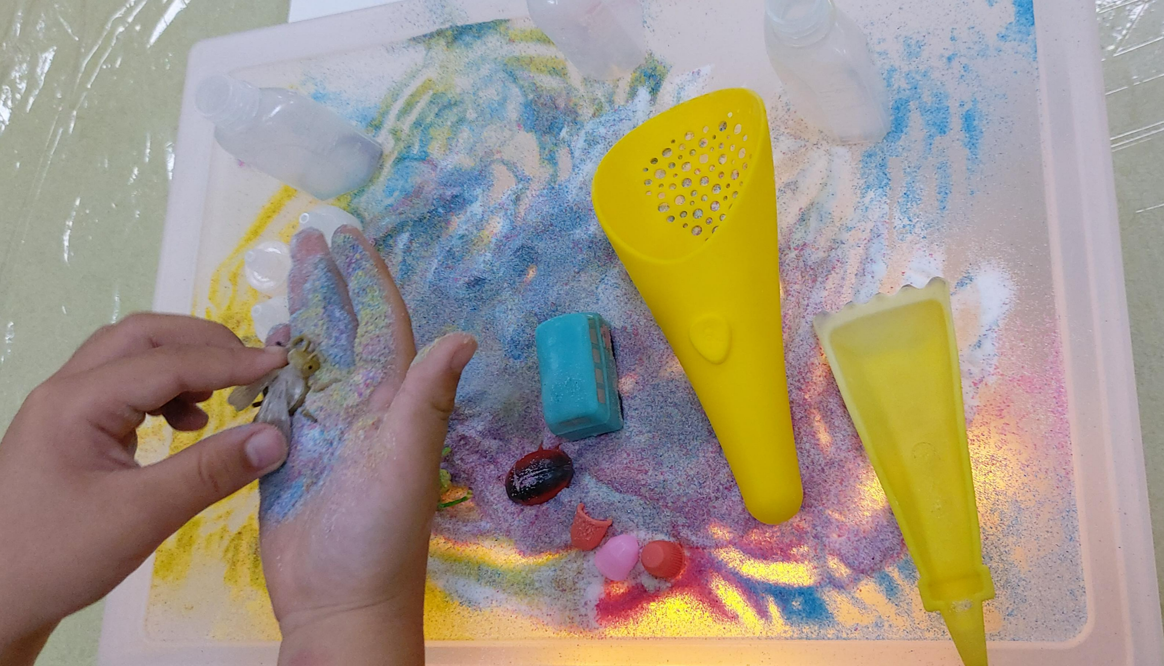 물감이 입혀진 모래와 장난감으로 아이만의 상상속 세계를 표현합니다.