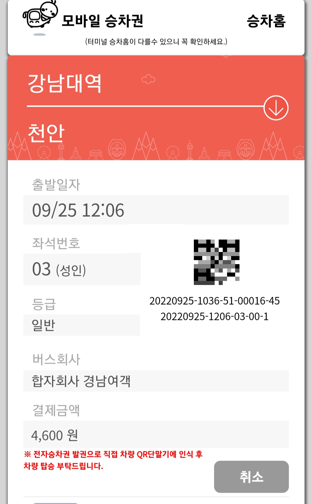 예매가 완료되면 아래와 같이 모바일 승차권이 발급됩니다.