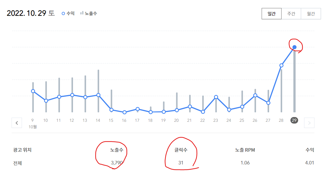 메인 노출이 된 날은 확실히 광고 클릭수가 평소보다 늘어난건 사실입니다. 평소보다 4~ 5배정도?