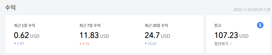 하루에 1달러도 안되는 경우도 많았지만 그래도 꾸준히 포스팅하니 이런날도 오네요.