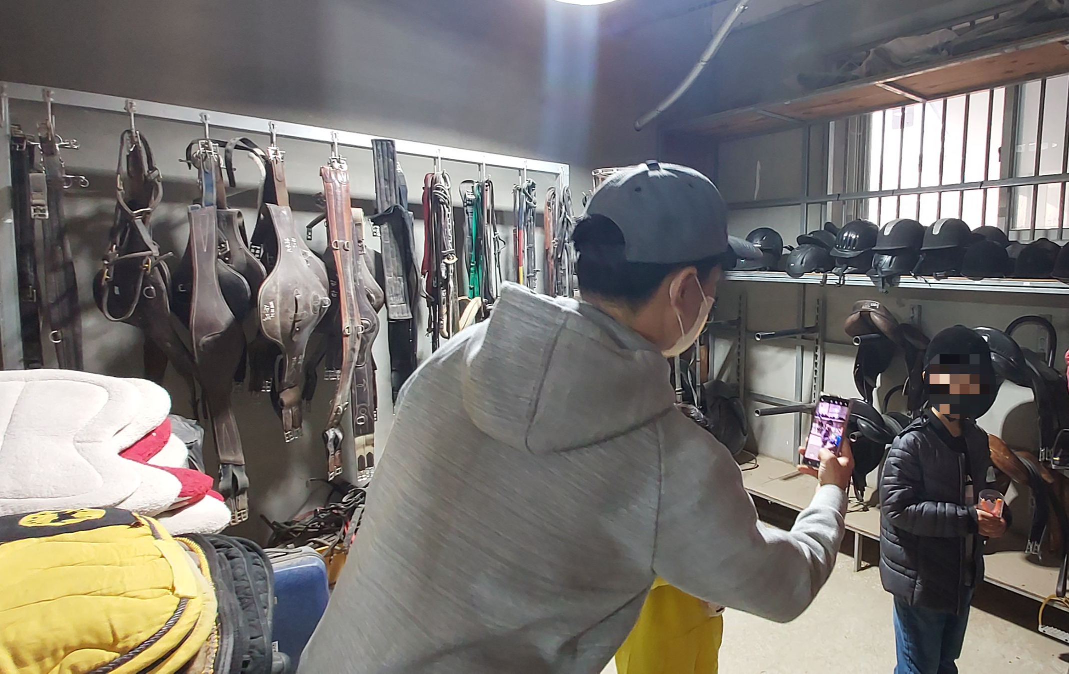 모든 장비를 착용하고 실내에서 말에 올라타봅니다.