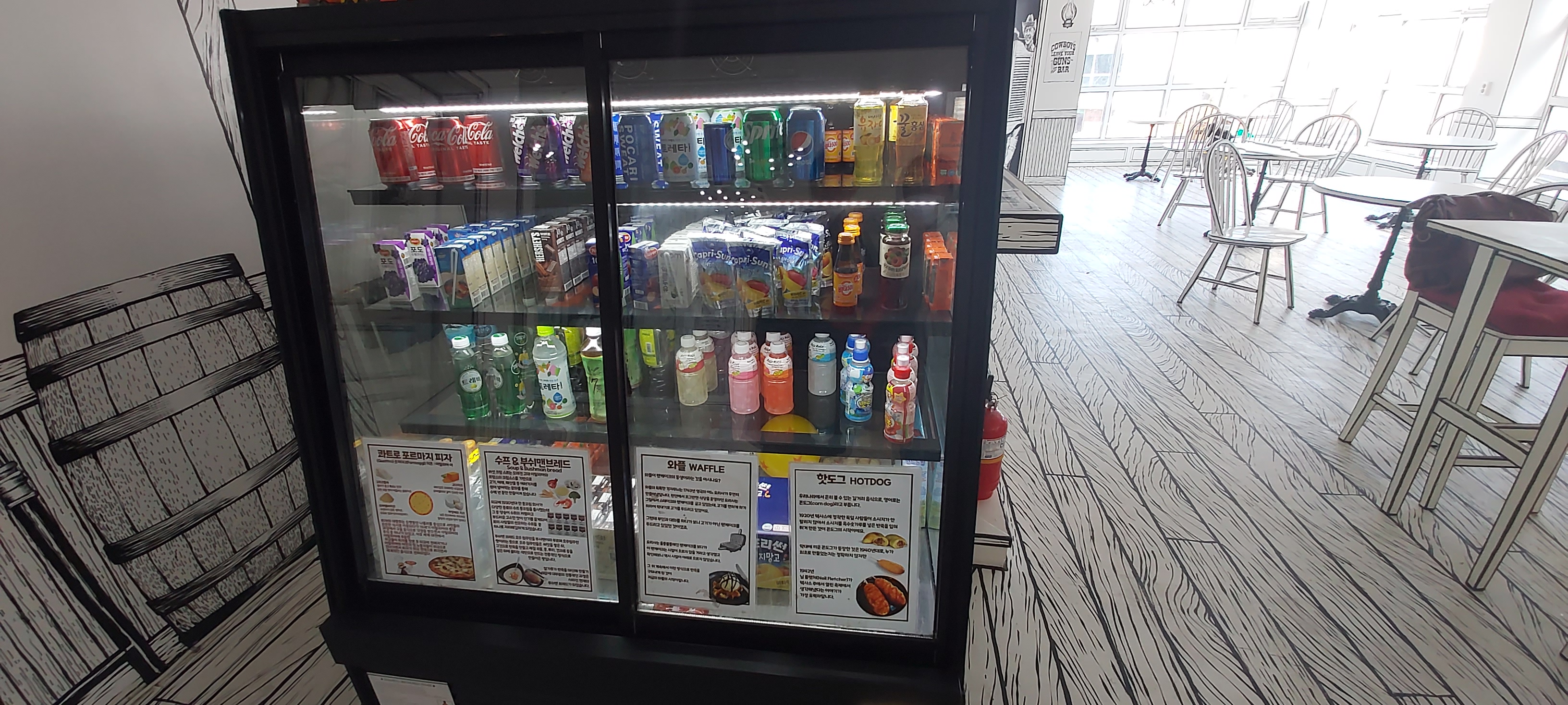 여기 냉장고에 들어가 있는 음료수 중 하나씩 선택하시면 됩니다.