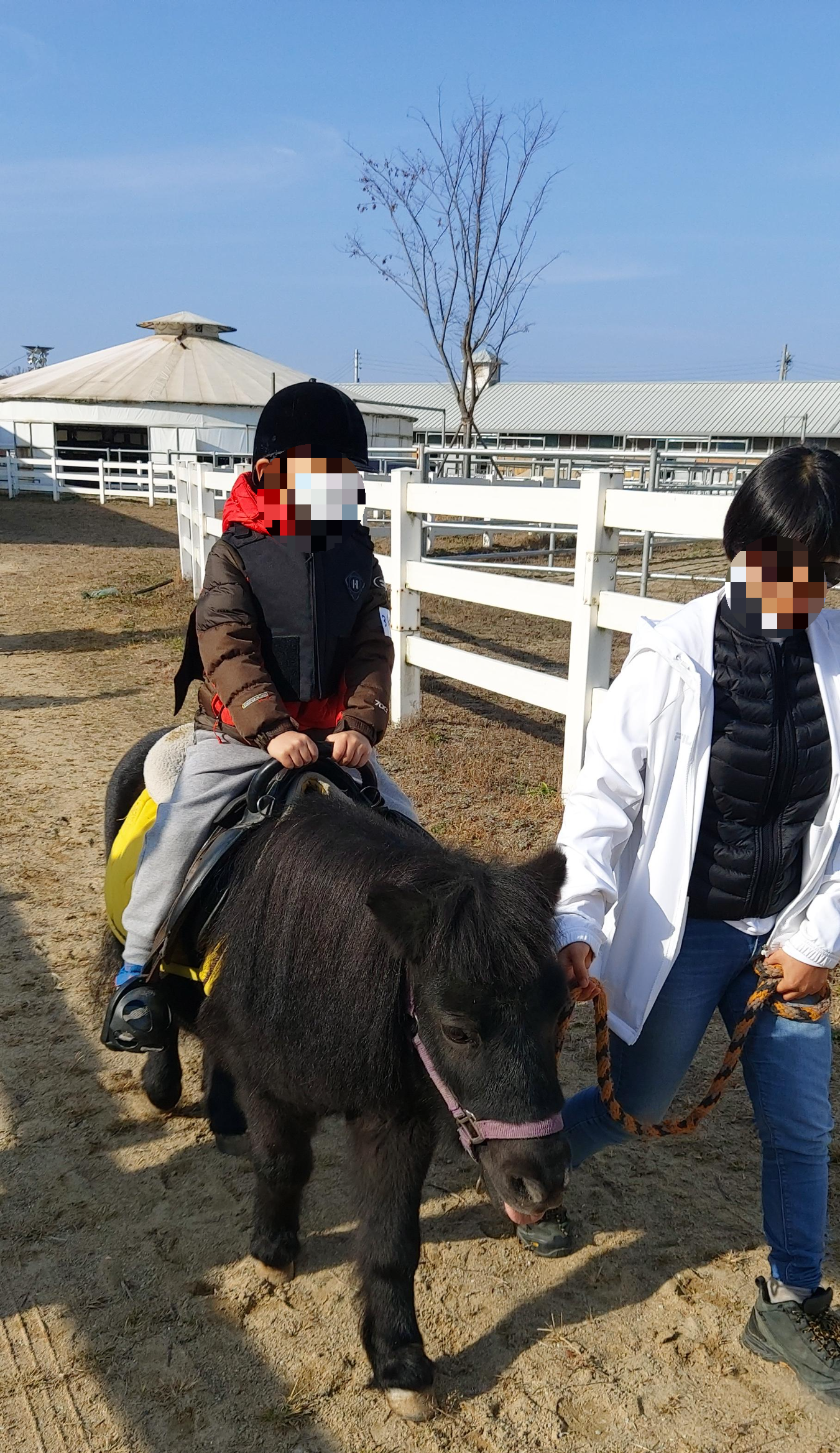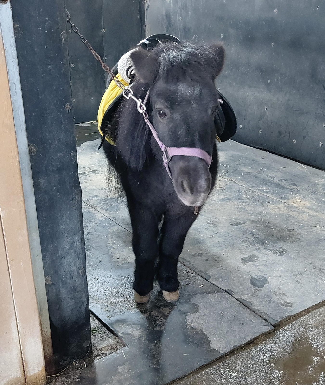 우리 아들은 제일 나이많은 검은색 조랑말을 타게 되었습니다.
