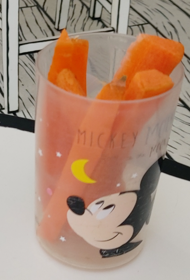 아이당 컵에 먹이용 당근을 주십니다. 이 컵을 들고 밖으로 동물들을 만나러 나갑니다.