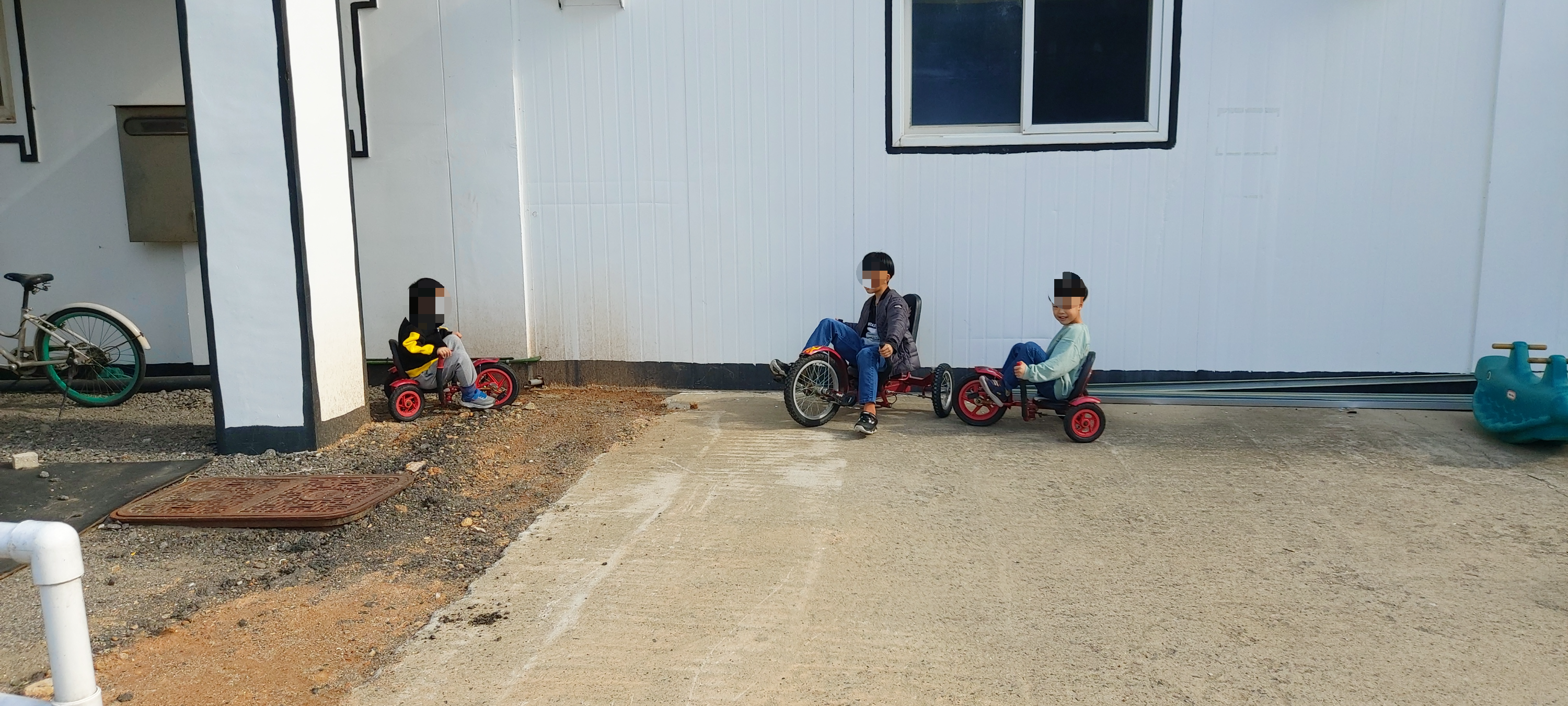 아이들이 아쉬웠던지 앞에 놓여진 세발자전거를 타며 시간을 끌어보네요.