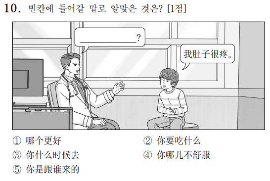 [해설] '배가 너무 아파요'라는 대답을 유도하는 질문을 찾는 문제입니다.