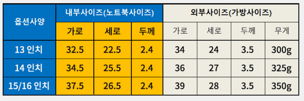 저는 삼성 16인치 노트북이라 15/16인치용으로 구매했습니다.