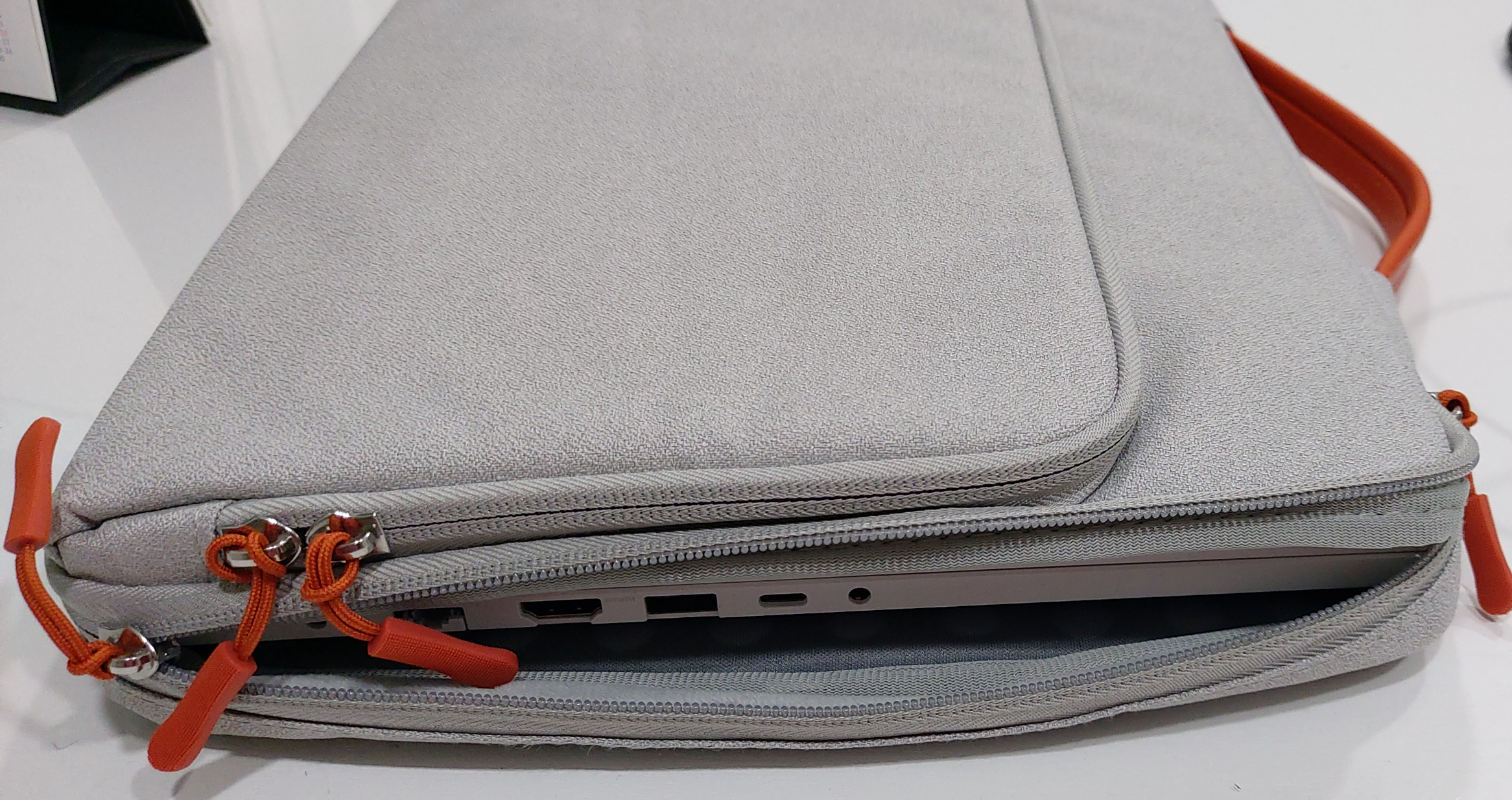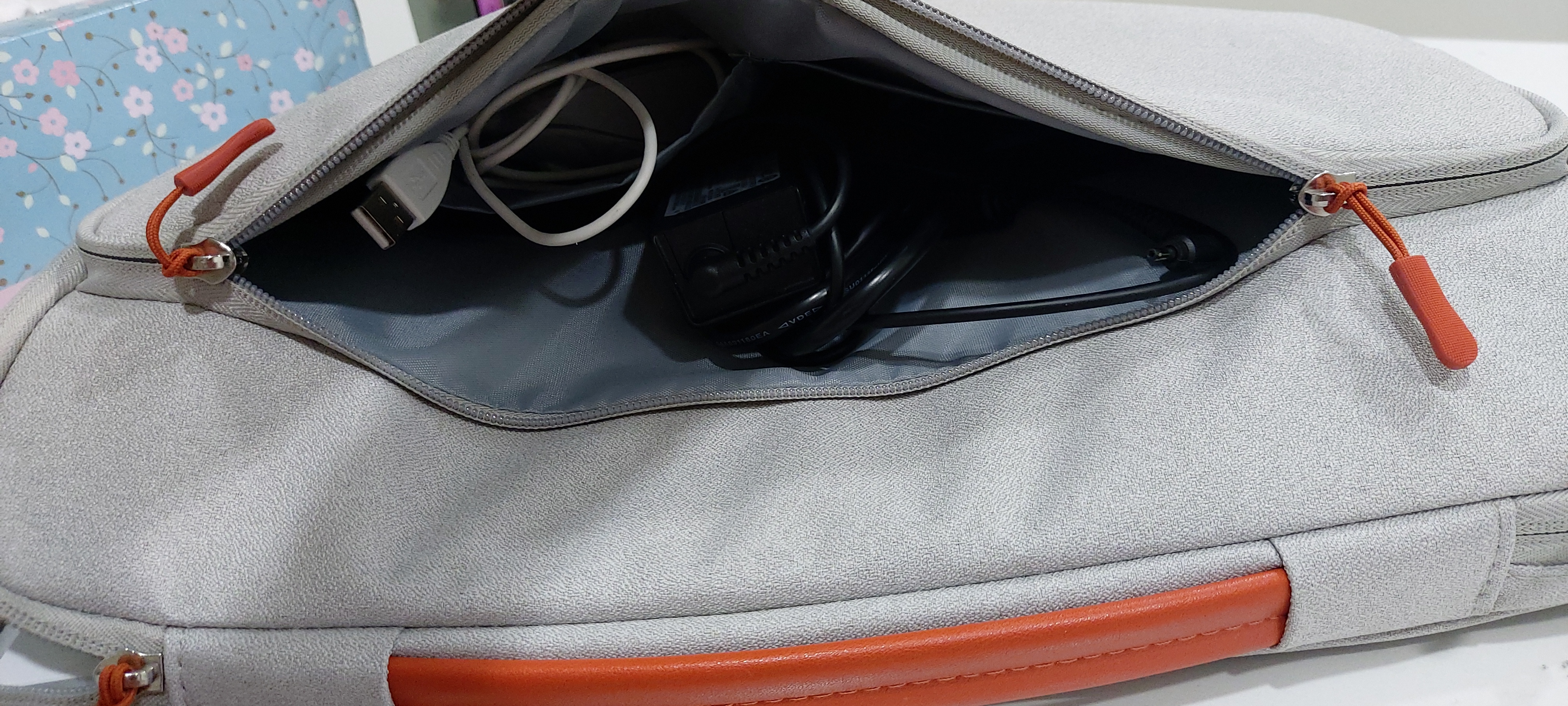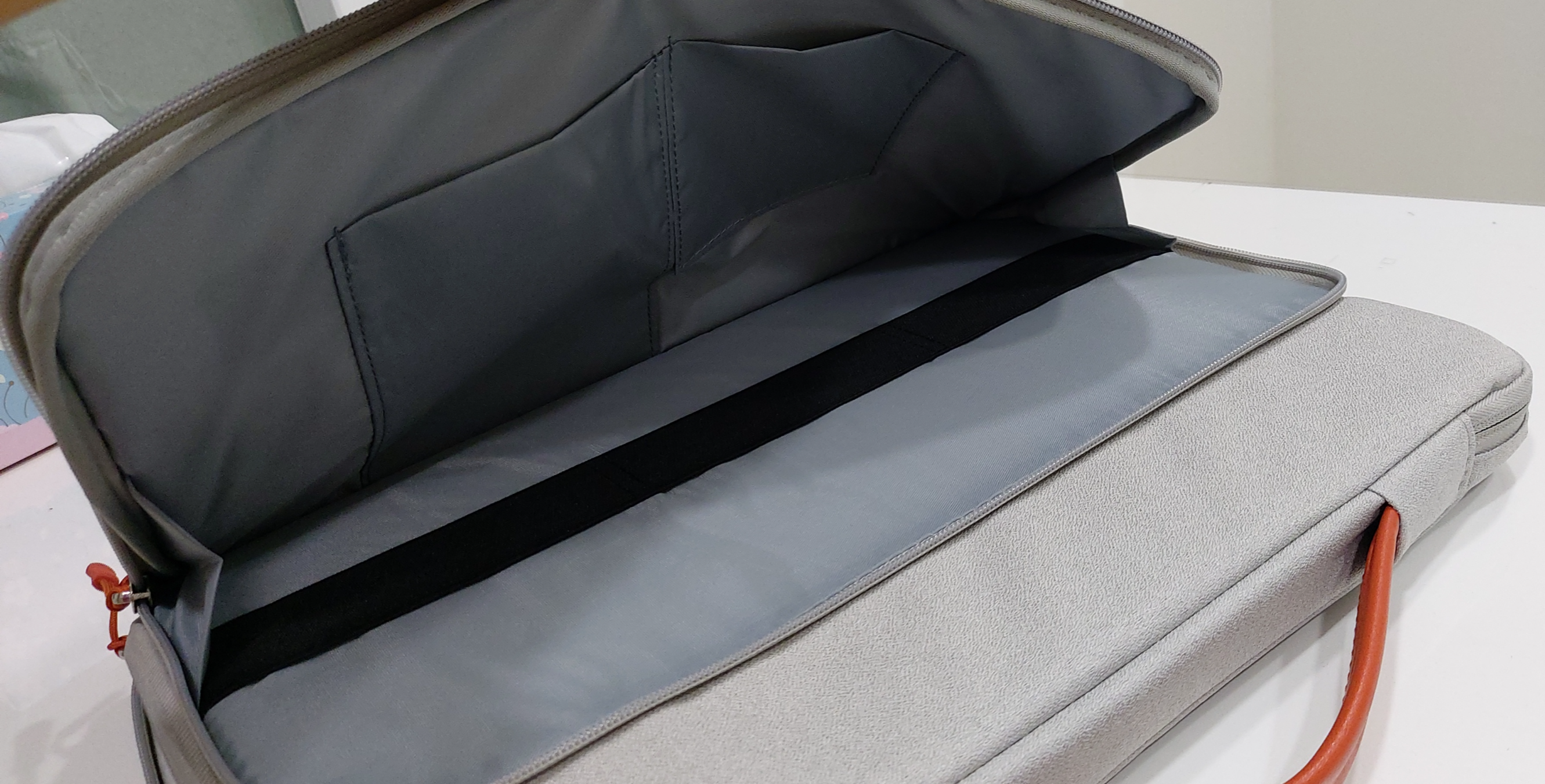 수납 포켓에 노트북 배터리와 마우스를 넣고 닫은 모습입니다.