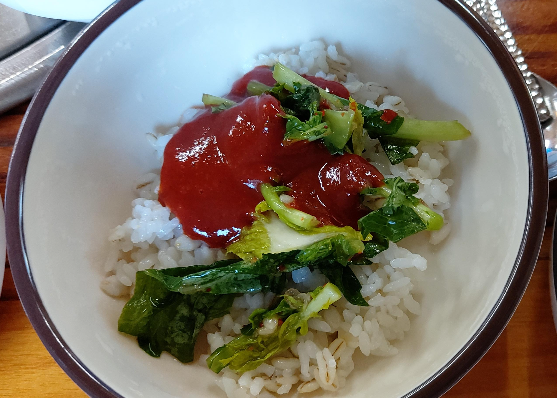 보리밥이 나오네요. 물김치와 고추장을 넣고 싹싹 비벼드시면 됩니다.